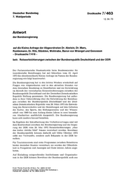 "content": "Deutscher Bundestag Drucksache 7/463 - 7. Wahlperiode 12.04.73 Antwort der Bundesregierung auf die Kleine Anfrage der Abgeordneten Dr. Abelein, Dr. Marx, Reddemann, Dr. Ritz, Stücklen, Wohlrabe, Baron von Wrangel und Genossen - Drucksache 7/418 - betr. Reiseerleichterungen zwischen der Bundesrepublik Deutschland und der DDR Der Parlamentarische Staatssekretär beim Bundesminister für innerdeutsche Beziehungen hat mit Schreiben vom 10. April 1973 die obenbezeichnete Kleine Anfrage im Namen der Bundes- regierung wie folgt beantwortet: Die Bundesregierung hat in den letzten Wochen wiederholt auf Fragen von Abgeordneten und in den aktuellen Stunden vor dem Deutschen Bundestag zu Einzelheiten und zur Entwicklung im Bereich der vereinbarten Reiseerleichterungen zwischen der Bundesrepublik Deutschland und der Deutschen Demokratischen Republik Stellung genommen. Die Bundesregierung hat außer- dem in ihrer Unterrichtung über die Entwicklung der Beziehun- gen zwischen der Bundesrepublik Deutschland und der Deut- schen Demokratischen Republik vom 28. März 1973 die Entwick- lung des Reiseverkehrs und der Beziehungen auf den Gebieten der Kultur, des Sports, des Bildungswesens und der Wissen- schaft von 1969 bis zum Anfang dieses Jahres in zwei besonde- ren Abschnitten ausführlich dargestellt. Die Bundesregierung kann sich insofern hierauf beziehen. Im Ergebnis der Inkraftsetzung des Verkehrsvertrages sind mit dem Briefwechsel zwischen der Bundesregierung und der Regie- rung der DDR vom 26. Mai 1972 Reiseerleichterungen „über das bisher übliche Maß\" hinaus vereinbart worden. Bewohner der Bundesrepublik können dadurch seit Mitte Oktober 1972 nicht nur Verwandte, sondern auch Bekannte in der DDR be- suchen. Für Touristenreisen sind erste Programme zwischen Reisebüros beider deutscher Staaten vereinbart; sie werden der Öffentlich- keit in Prospekten und Anzeigen seit Ende letzten Jahres ange- boten. Auf Einladung entsprechender Institutionen und Organisatio nen in der DDR können Bewohner der Bundesrepublik auch aus",