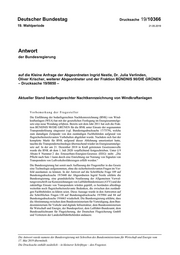 "content": "Drucksache 19/10366 –4– Deutscher Bundestag – 19. Wahlperiode desregierung plant die AVV zu ändern, um auch die Nutzung von Transponder signalen bei der bedarfsgesteuerten Nachtkennzeichnung nutzen zu können. Im Übrigen wird auf die Antwort zu Frage 5 verwiesen. 9. Wie viele Windkraftanlagen verfügen derzeit nach Kenntnis der Bundesre gierung über eine BNK, und welche Technologie der BNK kommt dabei zum Einsatz? Die Zustimmung zur Errichtung von Bauwerken, die ein Luftfahrthindernis dar stellen, liegt im Zuständigkeitsgebiet der Länder. Daher liegen der Bundesregie rung keine eigenen Informationen vor. 10. Wie viele Windkraftanlagen über 100 Meter Höhe verfügen nach Kenntnis der Bundesregierung noch nicht über eine BNK? Dazu liegen der Bundesregierung keine Informationen vor. 11. Wie bewertet die Bundesregierung, dass weit fortgeschrittene BNK-Projekte mit Radartechnik aufgrund der Neuregelung und unerwarteten Erwähnung von der Transponderlösung pausiert bzw. abgebrochen wurden? Mit dem Energiesammelgesetz hat sich der Gesetzgeber für eine verpflichtende bedarfsgesteuerte Nachtkennzeichnung entschieden. Zurzeit sind ausschließlich primärradar- und passivradarbasierte Systeme luftverkehrsrechtlich zugelassen. Durch das Energiesammelgesetz wurde eine wesentliche Voraussetzung dafür ge schaffen, dass in Zukunft auch Technologien zur Anwendung kommen können, die auf der Auswertung von Transpondersignalen basiert. Die Pflicht ist techno logieneutral ausgestaltet. Satz: Satzweiss.com Print, Web, Software GmbH, Mainzer Straße 116, 66121 Saarbrücken, www.satzweiss.com Druck: Printsystem GmbH, Schafwäsche 1-3, 71296 Heimsheim, www.printsystem.de Vertrieb: Bundesanzeiger Verlag GmbH, Postfach 10 05 34, 50445 Köln, Telefon (02 21) 97 66 83 40, Fax (02 21) 97 66 83 44, www.betrifft-gesetze.de ISSN 0722-8333",