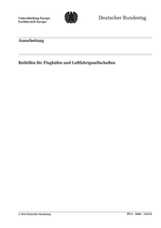 "content": "Unterabteilung Europa Ausarbeitung Seite 2 Fachbereich Europa PE 6 - 3000 - 152/18 Beihilfen für Flughäfen und Luftfahrtgesellschaften Aktenzeichen: PE 6 - 3000 - 152/18 Abschluss der Arbeit: 06.11.2018 Fachbereich: PE 6: Fachbereich Europa Die Arbeiten des Fachbereichs Europa geben nicht die Auffassung des Deutschen Bundestages, eines seiner Organe oder der Bundestagsverwaltung wieder. Vielmehr liegen sie in der fachlichen Verantwortung der Verfasserinnen und Verfasser sowie der Fachbereichsleitung. Arbeiten des Fachbereichs Europa geben nur den zum Zeitpunkt der Erstel- lung des Textes aktuellen Stand wieder und stellen eine individuelle Auftragsarbeit für einen Abgeordneten des Bun- destages dar. Die Arbeiten können der Geheimschutzordnung des Bundestages unterliegen, geschützte oder andere nicht zur Veröffentlichung geeignete Informationen enthalten. Eine beabsichtigte Weitergabe oder Veröffentlichung ist vorab der Fachbereichsleitung anzuzeigen und nur mit Angabe der Quelle zulässig. Der Fachbereich berät über die da- bei zu berücksichtigenden Fragen. Diese Ausarbeitung dient lediglich der bundestagsinternen Unterrichtung, von einer Weiterleitung an externe Stellen ist abzusehen.",
