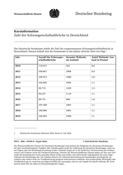 "content": "Wissenschaftliche Dienste Kurzinformation Zahl der Schwangerschaftsabbrüche in Deutschland Das Statistische Bundesamt erhebt die Zahl der vorgenommenen Schwangerschaftsabbrüche in 1 Deutschland. Danach beläuft sich die Gesamtzahl in den Jahren 2010 bis 2019 wie folgt: Jahr Anzahl der Schwanger- darunter Wohnsitz Anteil Wohnsitz Aus- schaftsabbrüche im Ausland land in Prozent 2010 110.431 925 0,8 2011 108.867 1006 0,9 2012 106.815 1088 1,0 2013 102.802 1092 1,1 2014 99.715 1250 1,3 2015 99.237 1110 1,1 2016 98.721 948 1,0 2017 101.209 1063 1,1 2018 100.986 1081 1,1 2019 100.893 1089 1,1 1 Statistisches Bundesamt (Destatis) 2020, Stand 31. Juli 2020. WD 9 - 3000 – 070/20 (5. August 2020) © 2020 Deutscher Bundestag Die Wissenschaftlichen Dienste des Deutschen Bundestages unterstützen die Mitglieder des Deutschen Bundestages bei ihrer mandatsbezogenen Tätigkeit. Ihre Arbeiten geben nicht die Auffassung des Deutschen Bundestages, eines sei- ner Organe oder der Bundestagsverwaltung wieder. Vielmehr liegen sie in der fachlichen Verantwortung der Verfasse- rinnen und Verfasser sowie der Fachbereichsleitung. Arbeiten der Wissenschaftlichen Dienste geben nur den zum Zeit- punkt der Erstellung des Textes aktuellen Stand wieder und stellen eine individuelle Auftragsarbeit für einen Abge- ordneten des Bundestages dar. Die Arbeiten können der Geheimschutzordnung des Bundestages unterliegende, ge- schützte oder andere nicht zur Veröffentlichung geeignete Informationen enthalten. Eine beabsichtigte Weitergabe oder Veröffentlichung ist vorab dem jeweiligen Fachbereich anzuzeigen und nur mit Angabe der Quelle zulässig. Der Fach- bereich berät über die dabei zu berücksichtigenden Fragen.",