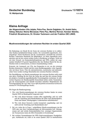 "content": "Deutscher Bundestag Drucksache 19/18574 19. Wahlperiode 16.04.2020 Kleine Anfrage der Abgeordneten Ulla Jelpke, Petra Pau, Sevim Dağdelen, Dr. André Hahn, Gökay Akbulut, Niema Movassat, Petra Pau, Martina Renner, Kersten Steinke, Friedrich Straetmanns, Dr. Kirsten Tackmann und der Fraktion DIE LINKE. Musikveranstaltungen der extremen Rechten im ersten Quartal 2020 Die Bedeutung von Musik für die Szene der extremen Rechten ist in zahlrei- chen Studien nachdrücklich belegt worden. Als vermeintlich unpolitische „Ein- stiegsdroge“ bieten Rechtsrock und die verschiedenen, innerhalb der extremen Rechten verbreiteten Musikstile die Möglichkeit, vor allem Jugendliche anzu- sprechen und mit der extrem rechten Szene in Berührung zu bringen. Nicht erst seit dem Versuch von Kameradschaftsspektrum und NPD, mittels der soge- nannten Schulhof-CD gezielt Jugendliche über das Medium Musik für ihre po- litischen Ziele zu interessieren, ist dieser Zusammenhang evident. Konzerte, der Austausch von CDs, das Eintauchen in ein von der extremen Rechten dominiertes Umfeld sind die ersten Berührungspunkte vieler Jugendli- cher mit dieser Szene. Über die nationalistischen, rassistischen und antisemiti- schen Texte werden wichtige Botschaften der extremen Rechten verbreitet. Die Durchführung von Musikveranstaltungen der extremen Rechten stellt somit eine aktive Werbung für die Ziele der Szene dar und lässt die extreme Rechte als attraktive Gestalterin jugendkultureller Freizeitangebote erscheinen. In zahl- reichen Regionen der Bundesrepublik Deutschland stellen solche Veranstaltun- gen die herausragenden und deshalb besonders beliebten Möglichkeiten der Freizeitgestaltung dar (vgl. http://www.bpb.de/politik/extremismus/rechtsextre mismus/41758/einstiegsdroge-musik). Wir fragen die Bundesregierung: 1. Wie viele Musikveranstaltungen der extremen Rechten fanden im ersten Quartal 2020 im Bundesgebiet insgesamt statt? a) Wie viele dieser Konzerte wurden offen angekündigt, und wie stellt sich die Verteilung nach Bundesländern dar (bitte nach Bundesländern, Orten und Datum, Musikgruppen, Liedermachern aufschlüsseln)? b) Wie viele dieser Konzerte wurden konspirativ angekündigt, und wie stellt sich die Verteilung nach Bundesländern dar? 2. Bei wie vielen der in Frage 1 aufgeführten Musikveranstaltungen trat die NPD oder eine ihrer Untergliederungen als Mitveranstalter bzw. Mitorga- nisator auf, und welche Kameradschaften bzw. sonstigen Organisationen der Neonaziszene traten als (Mit-)Veranstalter in Erscheinung? 3. Bei welchen Veranstaltungen der NPD (Saalveranstaltungen, Kundgebun- gen, Aufmärsche etc.) kam es im ersten Quartal 2020 zu musikalischen",