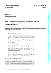"content": "Deutscher Bundestag Drucksache 19/19821 19. Wahlperiode 08.06.2020 Vorabfassung - wird durch die lektorierte Version ersetzt. Antwort der Bundesregierung auf die Kleine Anfrage der Abgeordneten Bernd Reuther, Frank Sitta, Torsten Herbst, weiterer Abgeordneter und der Fraktion der FDP – Drucksache 19/19473 – Hintergründe zur Rückholaktion deutscher Reisender durch die Bundesregierung aufgrund der Corona-Pandemie Vorbemerkung der Fragesteller Als die Corona-Pandemie ausbrach waren tausende deutsche Reisende im Ausland. Von Mitte März 2020 bis zum Osterwochenende wurden inzwischen mehr als 225 000 Deutsche vom Auswärtigen Amt zurück in ihr Heimatland gebracht. Damit handelt es sich um die größte Rückholaktion in der deutschen Geschichte. Nachdem eine mittlere vierstellige Zahl Reisender auch aus Süd- afrika, Argentinien und Peru ausgeflogen wurden, wird die Aktion beendet sein. Dann werden sich die Botschaften nur noch um Einzelfälle kümmern (https://www.sueddeutsche.de/reise/coronavirus-urlauber-rueckholaktion-hei mreise-1.4848700). Die Rückholaktion wurde gestartet, nachdem es aus knapp 60 Ländern keine regulären Rückflüge mehr gab. Mit den 50 Mio. Euro der Bundesregierung wurden Flugzeuge gechartert, um die Festsitzenden nach Hause zu fliegen. Das Rückholprogramm ist vorrangig für Deutsche und ihre Familienangehöri- gen in den besonders von Reiseeinschränkungen betroffenen Regionen ge- dacht, die sich dort vorübergehend aufhalten. Individualreisende müssen aller- dings weiterhin versuchen, sofern ihr Land nicht auf der Rückholliste steht, selbst eine Ausreise zu organisieren. Laut Auswärtigem Amt orientieren sich die Preise an einem vergleichbaren Flugticket der Econmyklasse. „Es muss niemand in Vorleistung treten. Aller- dings werden die Betroffenen einen im Konsulargesetz festgeschriebenen An- teil der Kosten tragen müssen.“ (https://www.auswaertiges-amt.de/de/ReiseUn dSicherheit/-/2320116?openAccordionId=item-2321454-13-panel). Vorbemerkung der Bundesregierung Ziel der am 17. März 2020 begonnenen Rückholaktion des Auswärtigen Amtes war, deutschen Staatsangehörigen und ihren Familienangehörigen, die sich vorübergehend in besonders von Reiseeinschränkungen betroffenen Regionen im Ausland aufhielten, die Rückkehr nach Deutschland zu ermöglichen, wenn eine selbstorganisierte Rückreise nach Deutschland nicht durchführbar war. Be- Die Antwort wurde namens der Bundesregierung mit Schreiben des Auswärtigen Amts vom 8. Juni 2020 übermittelt. Die Drucksache enthält zusätzlich – in kleinerer Schrifttype – den Fragetext.",