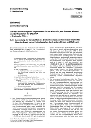 "content": "Deutscher Bundestag Drucksache 7/1089 7. Wahlperiode 17.10.73 Sachgebiet 450 Antwort der Bundesregierung auf die Kleine Anfrage der Abgeordneten Dr. de With, Dürr, von Schoeler, Kleinert und der Fraktionen der SPD, FDP - Drucksache 7/864 - betr. Auswirkung der Vorschriften des Ersten Gesetzes zur Reform des Strafrechts über den Ersatz kurzer Freiheitsstrafen durch andere Strafen und Maßregeln Der Bundesminister der Justiz hat mit Schreiben gleiche Vorschrift des § 14 StGB i.d.F. des Arti- vom 9. Oktober 1973 — 4000/1 T — 6 — 21 072/73 — kels 1 des 1. StrRG). Auf den Strafvollzug wirkt die Kleine Anfrage wie folgt beantwortet: sich ferner die am 1. September 1969 in Kraft getretene Regelung aus, nach der eine Freiheits- strafe unter sechs Monaten ohne Rücksicht auf generalpräventive Gesichtspunkte zur Bewäh- rung ausgesetzt werden muß, wenn zu erwarten Wie haben sich die Vorschriften des Ersten Geset- zes zur Reform des Strafrechts über den Ersatz kur- ist, daß der Verurteilte auch ohne die Einwirkung zer Freiheitsstrafen durch andere Sanktionen aus- des Strafvollzugs keine Straftaten mehr begehen gewirkt? wird (§ 23 Abs. 1, 3 i.d.F. des Artikels 1 des Wie entwickelten sich insbesondere vor und nach 1. StrRG; § 23 Abs. 1, 2 in der Übergangsfassung dem Inkrafttreten der neuen gesetzlichen Vorschrif- des Artikels 106 des 1. StrRG). Praktische Aus- ten wirkungen haben die genannten Regelungen a) die Verurteilungen schon einige Monate vor ihrem Inkrafttreten — zu Freiheitsstrafen unter sechs Monaten gehabt, weil die Vollstreckungsbehörden im (zur Bewährung ausgesetzt und nicht aus- Vorgriff auf die vom Bundestag beschlossene gesetzt) Rechtsänderung im Gnadenweg von der Voll- — zu Geldstrafen, streckung kurzer Freiheitsstrafen abgesehen b) die Höhe der verhängten Geldstrafen, haben. c) die Belegungszahlen im Strafvollzug im Hin- 2. Die bisherigen Beobachtungen über die Folgen blick auf dieser Rechtsänderungen lassen das Urteil zu, — Freiheitsstrafen unter sechs Monaten daß die Verhängung und die Vollstreckung kur- (aufgrund nicht ausgesetzter Freiheitsstrafen und nach Widerruf der Strafaussetzung), zer Freiheitsstrafen nach dem Inkrafttreten des — Ersatzfreiheitsstrafen. neuen Rechts in sehr erheblichem Maße zurück- gegangen sind. Dies entsprach den Erwartungen Können die vorstehenden Angaben nach einzelnen Deliktsgruppen aufgegliedert werden? des Gesetzgebers. Im Hinblick auf den Ersatz kurzer Freiheitsstrafen durch die Geldstrafe und die Strafaussetzung sind die Auswirkungen des I. 1. StrRG deshalb positiv zu beurteilen. Das Allgemeines schließt nicht aus, daß sich in einzelnen Bezirken oder in einzelnen Zeitabschnitten die Verurtei- 1. Den Ersatz kurzer Freiheitsstrafen durch andere lungen zu kurzen Freiheitsstrafen und die Voll- Sanktionen betrifft die mit dem Ersten Gesetz streckung solcher Strafen abweichend entwickelt zur Reform des Strafrechts (1. StrRG) vom haben. Seit dem Jahre 1972 ist die Verhängung 25. Juni 1969 (Bundesgesetzbl. I S. 645) in das und Vollstreckung kurzer Freiheitsstrafen im Strafgesetzbuch eingefügte Vorschrift, nach der ganzen Bundesgebiet nicht mehr wesentlich zu- eine Freiheitsstrafe unter sechs Monaten nur rückgegangen; zum Teil sind die einschlägigen unter besonderen, im Gesetz näher bezeichneten Zahlen leicht angestiegen. Es war jedoch von Umständen verhängt werden darf, während in vornherein nicht zu erwarten, daß sich die Zahl der Regel eine Geldstrafe auszusprechen ist. der kurzen Freiheitsstrafen ständig weiter ver- Diese Regelung ist am 1. September 1969 in Kraft ringern würde. Wenn man den Erfolg des getreten (§ 27 b StGB i.d.F. des Artikels 106 des 1. StrRG bei der Zurückdrängung kurzer Frei- 1. StrRG; seit dem 1. April 1970 gilt die inhaltlich heitsstrafen messen will, darf man nicht allein",