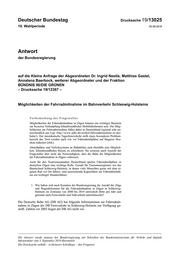 "content": "Deutscher Bundestag Drucksache 19/13025 19. Wahlperiode 05.09.2019 Antwort der Bundesregierung auf die Kleine Anfrage der Abgeordneten Dr. Ingrid Nestle, Matthias Gastel, Annalena Baerbock, weiterer Abgeordneter und der Fraktion BÜNDNIS 90/DIE GRÜNEN – Drucksache 19/12367 – Möglichkeiten der Fahrradmitnahme im Bahnverkehr Schleswig-Holsteins Vorbemerkung der Fragesteller Möglichkeiten der Fahrradmitnahme in Zügen können ein wichtiger Baustein zur besseren Verknüpfung klimafreundlicher Mobilitätsformen sein. Die Mög- lichkeiten zur Fahrradmitnahme fallen dabei in Deutschland regional sehr un- terschiedlich aus (vgl. http://www.adfc.de/artikel/fahrradmitnahme-in-der- bahn/). Der innerdeutsche Tagesfernverkehr stellt einen besonderen Problem- bereich dar. Dort werden nach wie vor Fahrradstellplätze auf längeren Stre- cken reduziert (ebd.). Abstellplätze und Verleihsysteme an Bahnhöfen sind ebenfalls eine Möglich- keit, klimafreundliches Reisen zu erleichtern. Sie ersetzen nach Ansicht der Fragesteller aber nicht die Notwendigkeit, dass die Bahn die Möglichkeiten der Fahrradmitnahme in Zügen verbessert. Auch für den Tourismusstandort Deutschland spielen Fahrradstellplätze in deutschen Zügen eine wichtige Rolle. Gerade für Tourismusregionen wie das Bundesland Schleswig-Holstein, in denen viele Menschen gerne mit dem ei- genen Rad vor Ort fahren, sind ausreichende Kapazitäten zur Fahrradmitnah- me ein wichtiger Standortfaktor. 1. Wie haben sich nach Kenntnis der Bundesregierung die Anzahl der Züge und Wagenkilometer für die Fahrradmitnahme in Zügen in Schleswig- Holstein im Zeitraum von 2000 bis 2019 entwickelt (bitte pro Jahr und getrennt nach Fernverkehr und Nahverkehr aufschlüsseln)? Die Deutsche Bahn AG (DB AG) hat folgende Informationen zur Fahrradmit- nahme in Zügen der DB Fernverkehr in Schleswig-Holstein zur Verfügung ge- stellt. Zahlen vor 2003 liegen der DB AG nicht vor. Die Antwort wurde namens der Bundesregierung mit Schreiben des Bundesministeriums für Verkehr und digitale Infrastruktur vom 3. September 2019 übermittelt. Die Drucksache enthält – in kleinerer Schrifttype – den Fragetext.",