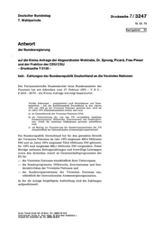"content": "Deutscher Bundestag Drucksache 7/3247 7. Wahlperiode 19.02.75 Sachgebiet 63 Antwort der Bundesregierung auf die Kleine Anfrage der Abgeordneten Wohlrabe, Dr. Sprung, Picard, Frau Pieser und der Fraktion der CDU/CSU - Drucksache 7/3130 - betr. Zahlungen der Bundesrepublik Deutschland an die Vereinten Nationen Der Parlamentarische Staatssekretär beim Bundesminister der Finanzen hat mit Schreiben vom 17. Februar 1975 – V B 3 – F 2435 – 20/75 – die Kleine Anfrage wie folgt beantwortet: Welche Zahlungen — aufgegliedert nach Einzelplänen und Haus-- haltstiteln — hat die Bundesrepublik Deutschland in den Jahren 1973 und 1974 an die Vereinten Nationen geleistet bzw. wird sie im Jahre 1975 (Haushaltsansätze) leisten, und zwar a) im Gesamtbereich der Vereinten Nationen (VN), b) zur Unterstützung der von den VN veranlaßten einzelnen Sonderprogramme, Hilfswerke, Konventionen und Sonderaktio- nen, wobei die einzelnen Maßnahmen getrennt aufzuführen sind, c) als Beitrag zur Finanzierung der Sonderorganisationen der VN (einschließlich der Internationalen Atomenergieorganisation)? Die Bundesrepublik Deutschland hat für den gesamten Bereich der Vereinten Nationen im Jahr 1973 insgesamt 499,4 Millionen DM und im Jahre 1974 insgesamt 722,6 Millionen DM geleistet; für 1975 sind insgesamt 886,1 Millionen DM vorgesehen. Diese Beträge umfassen Beitragszahlungen und freiwillige Leistungen sowie den deutschen Anteil an Gemeinschaftsprogrammen der EG für — die Vereinten Nationen einschließlich ihrer Unterorgane, — die Sonderprogramme, Hilfswerke, Konventionen und Son- deraktivitäten der Vereinten Nationen und — die Sonderorganisationen der Vereinten Nationen ein schließlich der Internationalen Atomenergieorganisation. In der als Anlage beigefügten Aufstellung sind die Zahlungen aufgeschlüsselt.",