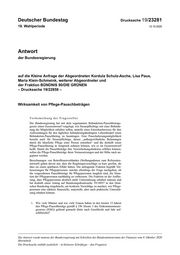 "content": "Deutscher Bundestag Drucksache 19/23281 19. Wahlperiode 12.10.2020 Antwort der Bundesregierung auf die Kleine Anfrage der Abgeordneten Kordula Schulz-Asche, Lisa Paus, Maria Klein-Schmeink, weiterer Abgeordneter und der Fraktion BÜNDNIS 90/DIE GRÜNEN – Drucksache 19/22858 – Wirksamkeit von Pflege-Pauschbeträgen Vorbemerkung der Fragesteller Die Bundesregierung hat mit dem sogenannten Behinderten-Pauschbetrags- gesetz einen Gesetzentwurf vorgelegt, wie Steuerpflichtige mit einer Behinde- rung die Möglichkeit erhalten sollen, anstelle eines Einzelnachweises für ihre Aufwendungen für den täglichen behinderungsbedingten Lebensbedarf einen Behinderten-Pauschbetrag zu beantragen. Eine Pauschalierungsmöglichkeit besteht auch für Steuerpflichtige, denen „außergewöhnliche Belastungen durch die häusliche Pflege einer Person entstehen“ und die deshalb einen Pflege-Pauschbetrag in Anspruch nehmen können, wie es im Gesetzentwurf heißt. Damit die Pauschbeträge ihre Vereinfachungsfunktion erfüllen können, sollen die Pflege-Pauschbeträge ihren Voraussetzungen und der Höhe nach an- gepasst werden. Berechnungen von Betroffenenverbänden (Stellungnahmen zum Referenten- entwurf) gehen davon aus, dass die Regelungsvorschläge zu kurz greifen, als dass sie einen spürbaren Effekt hätten. Die anfragende Fraktion begrüßt Ver- besserungen für Pflegepersonen, möchte allerdings der Frage nachgehen, ob die vorgesehenen Pauschbeträge für Pflegepersonen tauglich sind, die Situa- tion der Pflegepersonen nachhaltig zu verbessern. Die Fraktion ist der Auffas- sung, dass Pflegepersonen deutlich mehr Unterstützung erhalten müssen und hat deshalb einen Antrag auf Bundestagsdrucksache 19/18957 in den Deut- schen Bundestag eingebracht, um konkrete Vorschläge zu machen, wie Pflege- personen eine stärkere finanzielle, materielle, aber auch praktische Unterstüt- zung erhalten können. 1. Wie viele Männer und wie viele Frauen haben in den letzten 15 Jahren den Pflege-Pauschbeträge gemäß § 33b Absatz 3 des Einkommensteuer- gesetzes (EStG) geltend gemacht (bitte nach Geschlecht und Jahr auf- schlüsseln)? Die Antwort wurde namens der Bundesregierung mit Schreiben des Bundesministeriums der Finanzen vom 9. Oktober 2020 übermittelt. Die Drucksache enthält zusätzlich – in kleinerer Schrifttype – den Fragetext.",