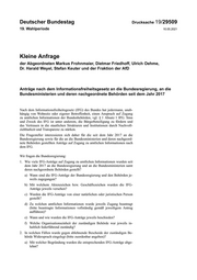 "content": "Deutscher Bundestag Drucksache 19/29509 19. Wahlperiode 10.05.2021 Kleine Anfrage der Abgeordneten Markus Frohnmaier, Dietmar Friedhoff, Ulrich Oehme, Dr. Harald Weyel, Stefan Keuter und der Fraktion der AfD Anträge nach dem Informationsfreiheitsgesetz an die Bundesregierung, an die Bundesministerien und deren nachgeordnete Behörden seit dem Jahr 2017 Nach dem Informationsfreiheitsgesetz (IFG) des Bundes hat jedermann, unab- hängig von Wohnsitz oder eigener Betroffenheit, einen Anspruch auf Zugang zu amtlichen Informationen der Bundesbehörden, vgl. § 1 Absatz 1 IFG. Sinn und Zweck des IFG ist unter anderem, die Bürgerbeteiligung zu fördern und das Vertrauen in die staatlichen Strukturen und Institutionen durch Nachvoll- ziehbarkeit und Transparenz zu stärken. Die Fragesteller interessieren sich daher für die seit dem Jahr 2017 an die Bundesregierung sowie für die an die Bundesministerien und deren nachgeord- nete Behörden gestellten Anträge auf Zugang zu amtlichen Informationen nach dem IFG. Wir fragen die Bundesregierung: 1. Wie viele IFG-Anträge auf Zugang zu amtlichen Informationen wurden seit dem Jahr 2017 an die Bundesregierung und an die Bundesministerien samt deren nachgeordnete Behörden gestellt? a) Wann sind die IFG-Anträge der Bundesregierung und den Behörden je- weils zugegangen? b) Mit welchem Aktenzeichen bzw. Geschäftszeichen wurden die IFG- Anträge jeweils versehen? c) Wurden die IFG-Anträge von einer natürlichen oder juristischen Person gestellt? d) Zu welchen amtlichen Informationen wurde jeweils Zugang beantragt (bitte beantragte Informationen vollständig gemäß jeweiligem Antrag aufführen)? e) Wann und wie wurden die IFG-Anträge jeweils beschieden? f) Welche Organisationseinheit der zuständigen Behörde war jeweils in- haltlich federführend zuständig? 2. In welchen Fällen wurde gegen ablehnende Bescheide der zuständigen Be- hörde Widerspruch eingelegt (bitte zuordenbar angeben)? a) Mit welcher Begründung wurden die entsprechenden IFG-Anträge abge- lehnt?",