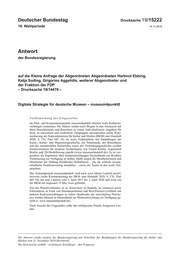"content": "Deutscher Bundestag Drucksache 19/15222 19. Wahlperiode 14.11.2019 Antwort der Bundesregierung auf die Kleine Anfrage der Abgeordneten Abgeordneten Hartmut Ebbing, Katja Suding, Grigorios Aggelidis, weiterer Abgeordneter und der Fraktion der FDP – Drucksache 19/14478 – Digitale Strategie für deutsche Museen – museum4punkt0 Vorbemerkung der Fragesteller Im Pilot- und Kooperationsprojekt museum4punkt0 arbeiten sechs Kulturein- richtungen zusammen. Die Häuser suchen nach Wegen, in den Austausch mit ihren Besucherinnen und Besuchern zu treten, individualisierte Angebote für diese zu entwickeln und zusätzliche Zielgruppen anzusprechen (siehe Kom- mentierung der Staatsministerien für Kultur und Medien (BKM) zum Haushalt 2020, S. 176, Titel 685 34). In sechs Teilprojekten mit Sammlungen der Kunst-, Kultur- und Migrationsgeschichte, der Naturkunde, des Brauchtums und des immateriellen Kulturerbes sowie der Technologiegeschichte werden Einsatzszenarien für moderne Technologien, wie Virtual Reality, Augmented Reality und 3D-Modellierung erprobt (www.museum4punkt0.de) Es ist vor- gesehen, die Ergebnisse allen Kultureinrichtungen Deutschlands zur flexiblen Nachnutzung zur Verfügung zu stellen. Dafür sorgen die Mitarbeiterinnen und Mitarbeiter der Stiftung Preußischer Kulturbesitz – die die zentrale wissen- schaftliche Projektsteuerung innehaben – sowie die Teams in den sechs Teil- projekten. Das Verbundprojekt museum4punkt0 wird nach zwei Jahren Laufzeit positiv bewertet (siehe Kommentierung der BKM zum Haushalt 2020, S. 176, Titel 685 34), hat eine Laufzeit vom 3. April 2017 bis 2. April 2020 und wird von der BKM mit insgesamt 15 Mio. Euro gefördert. Ziel des Projektverbundes ist es, Know-how zu bündeln, zu vernetzen sowie Erkenntnisse in Form von Dokumentationen und Best-Practice-Leitfäden mit anderen Kultureinrichtungen zu teilen. Quellcodes der entwickelten Prototy- pen werden Museen in Deutschland zur Weiterentwicklung zur Verfügung ge- stellt (s. www.museum4punkt0.de) Nach Ansicht der Fragesteller sollte das erfolgreiche Projekt fortgesetzt wer- den. Die Antwort wurde namens der Bundesregierung mit Schreiben der Beauftragten der Bundesregierung für Kultur und Medien vom 11. November 2019 übermittelt. Die Drucksache enthält – in kleinerer Schrifttype – den Fragetext.",