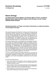 "content": "Deutscher Bundestag Drucksache 19/17348 19. Wahlperiode 24.02.2020 Kleine Anfrage der Abgeordneten Daniela Wagner, Kai Gehring, Markus Tressel, Lisa Badum, Matthias Gastel, Stefan Gelbhaar, Stephan Kühn (Dresden) und der Fraktion BÜNDNIS 90/DIE GRÜNEN Klimakompensation von Flügen und anderen Dienstreisen an außeruniversitären Forschungseinrichtungen Eine Grundvoraussetzung für erfolgreiche Forschung ist der überregionale und internationale fachliche Austausch und die entsprechende Zusammenarbeit zwischen Personen und Institutionen. In Zeiten der Klimakrise sind nach An- sicht vieler Wissenschaftlerinnen und Wissenschaftler (vgl. Statement der Jun- gen Akademie „Wahre Reisekosten erstatten“, vom 19. November 2019) sowie der Fragestellerinnen und Fragesteller gerade auch für reiseintensive For- schungseinrichtungen ein möglichst klimaschonendes Mobilitätsmanagement sowie die Klimakompensation von unvermeidbaren Reisen erforderlich. Die Bundesverwaltung strebt an, einschließlich ihrer Reisetätigkeit klimaneut- ral zu werden. Die einzelnen Einrichtungen sind bei der Nutzung von Video- konferenzsystemen und der Bevorzugung von Bahnreisen unterschiedlich weit fortgeschritten. Allen gemeinsam ist aber nach Einschätzung der Fragesteller, gewissermaßen als Mindeststandard, die Klimakompensation der gesamten Dienstreisetätigkeit (vgl. die Antwort der Bundesregierung auf die Kleine An- frage auf Bundestagsdrucksache 19/16280). Auch der Deutsche Bundestag wird seine Reisetätigkeit beginnend mit dem Jahr 2020 wieder kompensieren, dazu wurde in den laufenden Haushalt ein Titel eingestellt (Bundestagsdruck- sache 19/13923, Einzelplan 60, Kapitel 60 02, Titel 531 02). Im Falle der außeruniversitären Forschungseinrichtungen, die vom Bund und von den Ländern gemeinsam gefördert werden, ist die Klimakompensation der Reisetätigkeit, insbesondere der Flugreisen, entsprechend nur dann zuwen- dungsfähig, wenn für deren Haushaltspläne entsprechende Posten beschlossen werden. Wir fragen die Bundesregierung: 1. Nach welchen Regeln und Vorschriften werden nach Kenntnis der Bundes- regierung die Kosten von Dienstreisen an den außeruniversitären For- schungseinrichtungen erstattet? 2. Welche außeruniversitären Forschungseinrichtungen und Forschungsorgani- sationen verfügen nach Kenntnis der Bundesregierung über Mobilitätsma- nagements und Leitlinien, die den Klimaschutz adressieren? 3. Welche Maßnahmen zum Klimaschutz sind nach Kenntnis der Bundesregie- rung in diesen Leitlinien ggf. im Einzelnen enthalten?",
