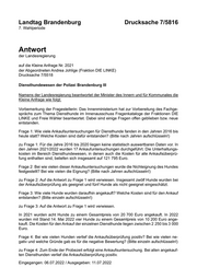 "outline": "- [Vorbemerkung der Fragestellerin: Das Innenministerium hat zur Vorbereitung des Fachgesprächs zum Thema Diensthunde im Innenausschuss Fragenkataloge der Fraktionen DIE LINKE und Freie Wähler beantwortet. Dabei sind einige Fragen offen geblieben bzw. ne...](#page-1)\n- [Frage 1: Wie viele Ankaufsuntersuchungen für Diensthunde fanden in den Jahren 2016 bis heute statt? Welche Kosten sind dafür entstanden? (Bitte nach Jahren aufschlüsseln!)](#page-1)\n- [zu Frage 1: Für die Jahre 2016 bis 2020 liegen keine statistisch auswertbaren Daten vor. In den Jahren 2021/2022 wurden 17 Ankaufuntersuchungen durchgeführt. Die Unterhaltungskosten im Bereich Diensthundewesen, in denen auch die Kosten für alle Ankauf...](#page-1)\n- [Frage 2: Bei wie vielen dieser Ankaufsuntersuchungen wurde die Nichteignung des Hundes festgestellt? Bei wie vielen die Eignung? (Bitte nach Jahren aufschlüsseln!)](#page-1)\n- [zu Frage 2: Auf die Antwort zu Frage 1 wird verwiesen. Insgesamt zwölf Hunde wurden bei der Ankaufsüberprüfung als geeignet und fünf Hunde als nicht geeignet eingeschätzt.](#page-1)\n- [Frage 3: Wie viele Hunde wurden daraufhin angekauft? Welche Kosten sind für den Ankauf entstanden? (Bitte einzeln aufschlüsseln!)](#page-1)\n- [zu Frage 3: Auf die Antwort zu Frage 1 wird verwiesen.](#page-1)\n- [In 2021 wurden acht Hunde zu einem Gesamtpreis von 20 700 Euro angekauft. In 2022 wurden mit Stand 14. Mai 2022 vier Hunde zu einem Gesamtpreis von 10 200 Euro angekauft. Die Kosten für den Ankauf der einzelnen Diensthunde liegen zwischen 2 250 bis 3 ...](#page-1)\n- [Frage 4: Bei wie vielen Hunden verlief die Ankaufsüberprüfung positiv? Bei wie vielen negativ und welche Gründe gab es für die negative Bewertung? (Bitte einzeln aufschlüsseln!)](#page-1)\n- [zu Frage 4: Zum Ende der Probezeit erfolgt eine Ankaufsuntersuchung. Bei allen angekauften Diensthunden verlief die Ankaufsüberprüfung positiv.](#page-1)\n- [Frage 5: Wie viele Hunde wurden nach welcher Zeit aus welchen Gründen an den Händler zurückgegeben bzw. der Kauf rückgängig gemacht? Welche Gründe gab es dafür jeweils? (Bitte einzeln aufschlüsseln!)](#page-2)\n- [zu Frage 5: Für den Zeitraum 2021 bis 14. Mai 2022 wurden folgende Daten recherchiert:](#page-2)\n- [Polizeidirektion (PD) Süd, Rückgabe von zwei Hunden:](#page-2)\n- [ in 2021 ein Hund aufgrund festgestellter Wesensschwächen und](#page-2)\n- [ in 2022 ein Hund aufgrund gesundheitlicher Mängel.](#page-2)\n- [Polizeidirektion Ost, in 2021 Rückgabe von drei Hunden](#page-2)\n- [ aufgrund gesundheitlicher Mängel](#page-2)\n- [ ein Hund nach sechs Wochen](#page-2)\n- [ ein Hund nach einer Woche](#page-2)\n- [ ein Hund nach einer Woche](#page-2)\n- [Polizeidirektion West, Rückgabe von sieben Hunden in 2021 und 2022](#page-2)\n- [ auf Grund gesundheitlicher Mängel](#page-2)\n- [ ein Hund nach neun Monaten](#page-2)\n- [ ein Hund nach zwei Monaten](#page-2)\n- [ ein Hund nach einem Monat](#page-2)\n- [ aufgrund festgestellter Wesensschwächen](#page-2)\n- [ während der Probezeit keine Ausbildungs-/Lernfortschritte erkennbar (nach zwei Monaten)](#page-2)\n- [ Trieblage zu hoch, für Anfängerin nicht steuerbar nach 1,5 Monaten](#page-2)\n- [ Wesensschwächen festgestellt (nach vier Wochen)](#page-2)\n- [ in einem Fall schied die Diensthundeführerin aus und der Hund konnte intern nicht weiter vermittelt/eingesetzt werden (nach 2,5 Monaten).](#page-2)\n- [Polizeidirektion Nord, Rückgabe von drei Hunden in 2021 und 2022](#page-2)\n- [ aufgrund festgestellter Wesensschwächen](#page-2)\n- [ kein Fortschritt im Leistungs- und Entwicklungsstand (nach einem Monat)](#page-2)\n- [ Hund zeigte ohne Reizlage ein Aggressionsverhalten gegenüber seinem Diensthundeführer (nach einem Monat)](#page-2)\n- [ in einem Fall schied der Diensthundeführer aus und eine anderweitige Verwendung für den Diensthund war nicht angezeigt (nach drei Monaten)](#page-3)\n- [Die Aufhebung aller Verträge erfolgte in der vereinbarten Probezeit und somit kostenneutral.](#page-3)\n- [Frage 6: Wie viele Hunde wurden nach welcher Zeit aus welchen Gründen weiterverkauft? Welche Einnahmen hatte das Land dadurch? (Bitte einzeln aufschlüsseln!)](#page-3)\n- [zu Frage 6: Für den Zeitraum 2021 bis 14. Mai 2022 liegen folgende Daten vor.](#page-3)\n- [Im Jahr 2021 wurde ein Diensthund aufgrund Ausscheidens der Diensthundeführerin und des Alters des Diensthundes (Bindung an die Diensthundeführerin) für 1 500 Euro verkauft.](#page-3)\n- [Im Jahr 2022](#page-3)\n- [ wurde ein Diensthund aufgrund fehlender Lernfortschritte verkauft. Die Einnahme belief sich auf 500 Euro. Der Einkaufspreis dieses Diensthundes belief sich vor zwei Jahren auf 600 Euro.](#page-3)\n- [ wurde ein Diensthund aufgrund fehlender Eignung des Hundes, die erst nach Ablauf der Probezeit festgestellt wurde, für 1 000 Euro verkauft.](#page-3)\n- [Frage 7: Im Fragenkatalog der LINKEN für den Innenausschuss gab das Innenministerium an, dass es nicht vorkommt, dass angekaufte Hunde sich später als nicht tauglich erweisen, da diese sorgfältig ausgesucht werden. Ist das Innenministerium sicher, das...](#page-3)\n- [zu Frage 7: Die Aussage als Antwort auf den Fragenkatalog muss revidiert werden, da es parallel zu dieser Annahme zwischenzeitlich zu einem solchen Fall im März 2022 und später im Mai 2022 kam. Im März und Mai 2022 wurden jeweils ein Diensthund, nach ...](#page-3)\n- [Frage 8: Im Fragenkatalog der LINKEN für den Innenausschuss gab das Innenministerium an, dass es in vier Fällen zu einer Trennung von Hund und Hundeführer ohne dessen Einwilligung kam. Welche Gründe führten im jeweiligen Einzelfall zu der Entscheidung...](#page-3)\n- [zu Frage 8: Antwort des Ministeriums des Innern und für Kommunales vom Februar 2022: „Im Jahr 2020 wurden 2 Diensthunde, welche als Junghunde von 2017/2018 von Diensthundeführern/-innen übernommen wurden, umgesetzt. Mit den Diensthundeführern/-innen u...](#page-3)\n-