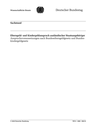 "content": "Wissenschaftliche Dienste Sachstand Seite 2 WD 9 - 3000 - 096/19 Elterngeld- und Kindergeldanspruch ausländischer Staatsangehöriger Anspruchsvoraussetzungen nach Bundeselterngeldgesetz und Bundeskindergeldgesetz Aktenzeichen: WD 9 - 3000 - 096/19 Abschluss der Arbeit: 12. März 2020 Fachbereich: WD 9: Gesundheit, Familie, Senioren, Frauen und Jugend Die Wissenschaftlichen Dienste des Deutschen Bundestages unterstützen die Mitglieder des Deutschen Bundestages bei ihrer mandatsbezogenen Tätigkeit. Ihre Arbeiten geben nicht die Auffassung des Deutschen Bundestages, eines sei- ner Organe oder der Bundestagsverwaltung wieder. Vielmehr liegen sie in der fachlichen Verantwortung der Verfasse- rinnen und Verfasser sowie der Fachbereichsleitung. Arbeiten der Wissenschaftlichen Dienste geben nur den zum Zeit- punkt der Erstellung des Textes aktuellen Stand wieder und stellen eine individuelle Auftragsarbeit für einen Abge- ordneten des Bundestages dar. Die Arbeiten können der Geheimschutzordnung des Bundestages unterliegende, ge- schützte oder andere nicht zur Veröffentlichung geeignete Informationen enthalten. Eine beabsichtigte Weitergabe oder Veröffentlichung ist vorab dem jeweiligen Fachbereich anzuzeigen und nur mit Angabe der Quelle zulässig. Der Fach- bereich berät über die dabei zu berücksichtigenden Fragen.",