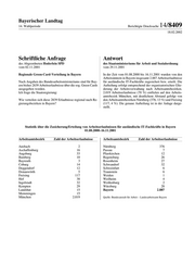 "content": "Bayerischer Landtag 14. Wahlperiode Berichtigte Drucksache 14/8409 18.02.2002 Schriftliche Anfrage Antwort des Abgeordneten Hoderlein SPD des Staatsministeriums für Arbeit und Sozialordnung vom 02.11.2001 vom 29.11.2001 Regionale Green-Card-Verteilung in Bayern In der Zeit vom 01.08.2000 bis 16.11.2001 wurden von den Arbeitsämtern in Bayern insgesamt 2.887 Arbeitserlaubnisse Nach Angaben des Bundesarbeitsministeriums sind für Bay- für ausländische IT-Fachkräfte zugesichert bzw. erteilt. Die ern bisher 2839 Arbeitserlaubnisse über die sog. Green Cards Aufteilung erfolgt entsprechend der organisatorischen Glie- ausgegeben worden. derung der Arbeitsverwaltung nach Arbeitsamtsbezirken. Ich frage die Staatsregierung: 2.019 Arbeitserlaubnisse (70 %) entfielen auf den Arbeits- amtsbezirk München, mit deutlichem Abstand gefolgt von Wie verteilen sich diese 2839 Erlaubnisse regional nach Re- den Arbeitsamtsbezirken Nürnberg (376; 13 %) und Freising gierungsbezirken in Bayern? (117; 4 %). Die genaue Aufteilung ist in der Anlage darge- stellt. Statistik über die Zusicherung/Erteilung von Arbeitserlaubnissen für ausländische IT-Fachkräfte in Bayern 01.08.2000–16.11.2001 Arbeitsamtsbezirk Zahl der Arbeitserlaubnisse Arbeitsamtsbezirk Zahl der Arbeitserlaubnisse Ansbach 2 Nürnberg 376 Aschaffenburg 16 Passau 7 Augsburg 33 Pfarrkirchen 12 Bamberg 10 Regensburg 26 Bayreuth 3 Rosenheim 27 Coburg 14 Schwandorf 32 Deggendorf 12 Schweinfurt 6 Donauwörth 5 Traunstein 6 Freising 117 Weiden 1 Hof 38 Weilheim 4 Ingolstadt 32 Weißenburg 2 Kempten 29 Würzburg 28 Landshut 15 Bayern 2.887 Memmingen 15 München 2.019 Quelle: Bundesanstalt für Arbeit – Landesarbeitsamt Bayern",