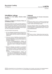 "content": "Bayerischer Landtag 16. Wahlperiode Drucksache 16/8270 13.05.2011 Schriftliche Anfrage Antwort des Abgeordneten Eike Hallitzky BÜNDNIS 90/DIE des Staatsministeriums für Wirtschaft, Infrastruktur, GRÜNEN Verkehr und Technologie vom 24.02.2011 vom 04.04.2011 Förderung von Standorten der Deutschen Telekom AG Zu 1.: mit öffentlichen Geldern Die Deutsche Telekom AG hat seit 2005 keine Fördermittel des Bayerischen Staatsministeriums für Wirtschaft, Infra Die Deutsche Telekom AG will ihre regionalen Standorte in struktur, Verkehr und Technologie erhalten. Bayern im Bereich des Vertriebs und Services(VSD) und der ITAbteilung drastisch reduzieren. Es stellt sich auch die Soweit die Deutsche Telekom AG im Rahmen der Breit Frage, in welchem Umfang diese Standorte durch öffentliche bandförderung Mittel von den Gemeinden erhalten hat, wird Gelder gefördert wurden. Eine Schließung würde die Ergeb auf die Förderliste im BreitbandPortal Bayern verwiesen: nisse dieser Förderpolitik zunichtemachen. www.breitband.bayern.de. Ich frage deshalb die Staatsregierung: Zu 2.: Siehe Antwort zu Frage 1. 1. Wie viele öffentliche Fördermittel hat die Deutsche Tele kom AG seit 2005 insgesamt von Bayern erhalten (bitte Zu 3.: insgesamt jährlich und nach einzelnen Geschäftssparten Siehe Antwort zu Frage 1. Darüber hinaus liegen auch aktu aufgliedern)? ell keine Anträge der Deutschen Telekom AG auf Förderung vor. 2. Welche der von der zur Schließung vorgesehenen Stand orte aus den Bereichen „IT“ und „Vertrieb und Service“ wurden mit Fördermitteln unterstützt (bitte Standorte mit dem Betrag aufführen)? a) Welche beschäftigungspolitischen Auflagen gab bzw. gibt es im Zusammenhang mit der Förderung (bitte konkret für die jeweiligen einzelnen Standorte beantworten: Zahl der Arbeitsplätze, Bindungsfrist etc.)? 3. Welche der bleibenden und geplanten zu erweiternden Standorte aus den Bereichen „IT“ und „Vertrieb und Ser vice“ wurden bzw. werden voraussichtlich mit Förder mitteln unterstützt (bitte Standorte mit dem Betrag auf führen)? a) Welche beschäftigungspolitischen Auflagen gab bzw. gibt es im Zusammenhang mit der Förderung (bitte konkret für die jeweiligen einzelnen Standorte beantworten: Zahl der Arbeitsplätze, Bindungsfrist etc.)? ______ Drucksachen, Plenarprotokolle sowie die Tagesordnungen der Vollversammlung und der Ausschüsse sind im Internet unter www.bayern.landtag.de Dokumente abrufbar. Die aktuelle Sitzungsübersicht steht unter www.bayern.landtag.de Aktuelles/Sitzungen/Tagesübersicht zur Verfügung.",