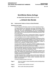 "content": "BÜRGERSCHAFT DER FREIEN UND HANSESTADT HAMBURG Drucksache 22/2182 22. Wahlperiode 20.11.20 Schriftliche Kleine Anfrage der Abgeordneten Olga Petersen (AfD) vom 12.11.20 und Antwort des Senats Betr.: Genderneutrale Toiletten an Schulen im Bezirk Wandsbek Einleitung für die Fragen: Auf die Anfrage der AfD-Fraktion mit der Drs. 22/715 antwortete der Senat: „An einigen Standorten der Hochschulen und Schulen, Bezirksämter, öffentli chen Unternehmen und in öffentlichen WC-Anlagen sind im Rahmen von Sanierungs-, Neu- oder Umbaumaßnahmen, zum Teil auf Anregungen der Studierenden-, Personal- und Gleichstellungsvertretungen, der Beschäftigten oder im Rahmen von Investitionsprogrammen ebenfalls genderneutrale Toilet ten errichtet worden.“ Somit bestätigte der Senat, dass es „genderneutrale Toiletten“ in den genann ten Einrichtungen gibt, deren Anzahl und Standort zu benennen möglich ist. Auf die Nachfragen mit der Drs. 22/847 antwortete der Senat: „Vor dem Hintergrund der grundsätzlich beabsichtigten Umstellung der öffent lichen Toiletten auf genderneutrale Angebote ist im Bereich der Freien und Hansestadt Hamburg bislang darauf verzichtet worden, speziell auf den Per sonenkreis inter- und transsexueller Menschen zugeschnittene Toiletten zu errichten oder zu betreiben. Im Übrigen siehe Drs. 22/715.“ Aus dieser Antwort ergab sich, dass keine zusätzlichen Toiletten für den Per sonenkreis inter- und transsexueller Menschen in den aufgeführten Standorten geschaffen wurden, jedoch gibt es genderneutrale Toiletten. Auf diese Nachfrage hin konnte der Senat in der Drs. 22/940 die Standorte für Kitas, Hochschulen, öffentliche Unternehmen, Behörden und öffentliche Toi letten nennen, jedoch für Schulen antwortete der Senat: „Die erfragten Daten werden durch SBH | Schulbau Hamburg statistisch nicht erfasst. Eine Abfrage aller Schulbauregionen, verbunden mit einer Vor-Ort- Kontrolle, ist in der für die Beantwortung einer Parlamentarischen Anfrage zur Verfügung stehenden Zeit nicht möglich. An einigen Schulstandorten in Hamburg gibt es bereits Unisex-Toiletten, das heißt eine Toilette für alle Geschlechter. Aktuell sind darüber hinaus keine Bedarfe nach gendergerechten Toiletten bekannt. Gesonderte Kosten sind hierfür nicht entstanden.“ Vor diesem Hintergrund frage ich den Senat: Frage 1: Gibt es an Schulen im Bezirk Wandsbek genderneutrale/genderge rechte Toiletten? Frage 2: In welchen Schulen befinden sich diese? Frage 3: Wann wurden diese jeweils geschaffen?",