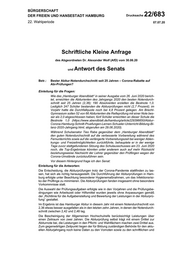 "content": "BÜRGERSCHAFT DER FREIEN UND HANSESTADT HAMBURG Drucksache 22/683 22. Wahlperiode 07.07.20 Schriftliche Kleine Anfrage des Abgeordneten Dr. Alexander Wolf (AfD) vom 30.06.20 und Antwort des Senats Betr.: Bester Abitur-Notendurchschnitt seit 25 Jahren – Corona-Rabatte auf Abi-Prüfungen? Einleitung für die Fragen: Wie das „Hamburger Abendblatt“ in seiner Ausgabe vom 26. Juni 2020 berich tet, erreichten die Abiturienten des Jahrgangs 2020 den besten Notendurch schnitt seit 25 Jahren (2,36); 190 Absolventen erzielten die Bestnote 1,0. Lediglich 247 Schüler bestanden die Abiturprüfungen nicht (2,7 Prozent); im Vorjahr hatte die Durchfallquote noch bei 4,8 Prozent gelegen. Am Brecht- Gymnasium sollen 52 von 66 Abiturienten die Reifeprüfung mit einer Note bes ser als 2,0 abgeschlossen haben; fünf Schüler erreichten an dieser Schule die Bestnote 1,0 (https://www.abendblatt.de/hamburg/article229396650/Abitur- Corona-Hamburg-Schnitt-Pruefungen-Lernen-Schueler-Unterricht-Bildung-Bi lanz-2020-Jahrgang.html; abgerufen am 29.06.2020). Während Schulsenator Ties Rabe gegenüber dem „Hamburger Abendblatt“ den guten Notendurchschnitt auf die verbesserte Vorbereitung während des Fernunterrichts sowie auf die verlängerte Vorbereitungszeit bei weniger Ablen- kungs- und Freizeitmöglichkeiten zurückführte, behauptete er in der wenige Tage zuvor stattgefundenen Sitzung des Schulausschusses am 23. Juni 2020 noch, die Top-Ergebnisse könnten unter anderem auch auf mehr Rücksicht beziehungsweise Nachsicht der Lehrer gegenüber den Prüflingen wegen der Corona-Umstände zurückzuführen sein. Vor diesem Hintergrund frage ich den Senat: Einleitung für die Antworten: Die Entscheidung, die Abiturprüfungen trotz der Corona-Pandemie stattfinden zu las sen, hat sich als richtig herausgestellt. Die Durchführung der Abiturprüfungen in Ham burg erfolgte unter Beachtung besonderer Hygienemaßnahmen, um das Infektionsrisi- ko der Prüflinge zu minimieren. Die Abiturprüfungen fanden insgesamt ohne besondere Vorkommnisse statt. Die Auswahl der Prüfungsaufgaben erfolgte wie in den Vorjahren und die Prüfungsbe dingungen wie Arbeitszeit oder Hilfsmittel wurden jeweils ohne Anpassungen gemäß der „Richtlinie für die Aufgabenstellung und Bewertung der Leistungen in der Abiturprü fung“ gestaltet. Im Ergebnis ist das Hamburger Abitur in diesem Jahr mit einem Notendurchschnitt von 2,36 etwas besser ausgefallen als in den letzten zehn Jahren, in denen der Notendurch schnitt zwischen 2,42 und 2,48 lag. Die Bescheinigung der Allgemeinen Hochschulreife berücksichtigt Leistungen über einen Zeitraum von zwei Jahren. Die Abiturprüfung selbst trägt mit einem Drittel zur Abiturnote bei, die Leistungen in den Pflicht- und Wahlfächern machen zwei Drittel aus. Zum gegenwärtigen Zeitpunkt liegen der für Bildung zuständigen Behörde für den aktu- ellen Abiturjahrgang noch keine Daten zu den Vornoten sowie zu den schriftlichen und",