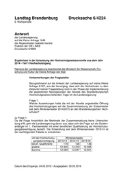 "content": "Landtag Brandenburg Drucksache 6/4224 6. Wahlperiode Antwort der Landesregierung auf die Kleine Anfrage 1649 der Abgeordneten Isabelle Vandre Fraktion der DIE LINKE Drucksache 6/3985 Ergebnisse in der Umsetzung der Hochschulgesetzesnovelle aus dem Jahr 2014 - Teil 1 Hochschulzugang Namens der Landesregierung beantwortet die Ministerin für Wissenschaft, For- schung und Kultur die Kleine Anfrage wie folgt: Vorbemerkungen der Fragesteller Bezugnehmend auf die Antwort der Landesregierung auf meine Kleine Anfrage 6/167, aus der hervorging, dass sich die Hochschulen zu dem Zeitpunkt meiner Fragestellung noch in der Phase der Implementierung der gesetzlichen Neuregelungen der Novelle des Brandenburgischen Hochschulgesetzes befanden, frage ich die Landesregierung: Frage 1: Welche Auswirkungen hatte die mit der Novelle angestrebte Öffnung des Hochschulzuganges auf die Zusammensetzung der Erstsemester seit dem Wintersemester 2014/2015 an den Brandenburgischen Hoch- schulen? zu Frage 1: Da die Frage hinsichtlich der Merkmale der Zusammensetzung keine Unterschei- dung trifft, geht die Landesregierung davon aus, dass sich die Frage auf die Studien- anfänger im 1. Fachsemester mit einer beruflichen Qualifizierung als Hochschulzu- gangsberechtigung bezieht. Die Entwicklung seit dem Wintersemester 2013/14 ist der nachfolgenden Tabelle zu entnehmen. Art der Hochschulzu- Wintersemester gangsberechtigung 2013/14 2014/15 2015/16 berufl. Qualifizierte 179 128 136 andere 12.404 12.419 12.465 Summe 12.583 12.547 12.601 Datum des Eingangs: 24.05.2016 / Ausgegeben: 30.05.2016",