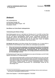 "content": "LANDTAG NORDRHEIN-WESTFALEN Drucksache 18/498 18. Wahlperiode 11.08.2022 Antwort der Landesregierung auf die Kleine Anfrage 169 des Abgeordneten Markus Wagner AfD Drucksache 18/245 Zwei Männer am Centro Beach niedergestochen Vorbemerkung der Kleinen Anfrage Nach Medienangaben kam es in der Nacht zum Sonntag, den 12. Juni 2022, auf dem Platz der Guten Hoffnung in der Neuen Mitte Oberhausen zu einer blutigen Auseinandersetzung, bei der zwei Männer lebensgefährlich verletzt wurden. Augenzeugen berichteten von Streitigkeiten zwischen zwei Personengruppen. Bei den Verletzten, die Stichverletzungen erlitten, handelt es sich um einen 28 und einen 30 Jahre alten Türken. Es bestand Lebensgefahr. Der oder die mutmaßlichen Täter konnten fliehen. 1 Der Minister des Innern hat die Kleine Anfrage 169 mit Schreiben vom 15. August 2022 im Einvernehmen mit dem Minister der Justiz namens der Landesregierung beantwortet. 1. Wie ist der Sachstand der polizeilichen und staatsanwaltschaftlichen Ermittlungen zu dem oben genannten Vorfall? (Bitte Tatverdächtige, Tathergang, Vorstrafen der Tatverdächtigen, Straftatbestände, Staatsbürgerschaften der Tatverdächtigen, Vornamen deutscher Tatverdächtiger und sonstige polizeiliche Erkenntnisse über die Tatverdächtigen nennen) Zur Beantwortung der Fragen hat mir das Ministerium der Justiz mit Schreiben vom 29.07.2022 folgende Informationen zur Verfügung gestellt: „Die Leitende Oberstaatsanwältin in Duisburg hat dem Ministerium der Justiz unter dem 25.07.2022 berichtet, dass die Ermittlungen wegen versuchten Totschlags andauerten. Ihrem Bericht zufolge ist der Tathergang in der Vorbemerkung der Kleinen Anfrage im Wesentlichen zutreffend skizziert. Zu Vorstrafen, Staatsbürgerschaften, Vornamen oder sonstigen polizeilichen Erkenntnissen von Tatverdächtigen verhält sich die Berichtslage nicht.“ 1 Vgl. https://www.bild.de/regional/ruhrgebiet/ruhrgebiet-aktuell/blutiger-streit-am-centro-oberhausen- zwei-maenner-in-lebensgefahr-80384392.bild.html. Datum des Originals: 11.08.2022/Ausgegeben:17.08.2022",