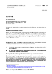 "content": "LANDTAG NORDRHEIN-WESTFALEN Drucksache 18/819 18. Wahlperiode 05.09.2022 Antwort der Landesregierung auf die Kleine Anfrage 304 vom 9. August 2022 der Abgeordneten Lisa-Kristin Kapteinat SPD Drucksache 18/461 Vorgehen der Landesregierung zur eingeschränkten Verfügbarkeit von Fiebersäften für Kinder Vorbemerkung der Kleinen Anfrage Fieber- und schmerzstillende Säfte für Kinder sind in vielen Apotheken deutschlandweit nur noch schwer zu bekommen. Auch in Nordrhein-Westfalen verweisen Apothekerinnen und Apo- 1 theker sowie Kinderärztinnen und Kinderärzte auf die schwierige Versorgungslage. Die Deut- sche Apothekenvereinigung ABDA spricht von einer „ganz besonders großen Herausforde- rung für Apotheken und Eltern.“ 2 Der Minister für Arbeit, Gesundheit und Soziales hat die Kleine Anfrage 304 mit Schreiben vom 2. September 2022 namens der Landesregierung beantwortet. 1. Wie plant die Landesregierung auf die aktuelle Knappheit von Fiebersäften für Kin- der zu reagieren? 4. Wie plant die Landesregierung, die aktuelle Versorgung der Krankenhäuser und Apotheken mit Fiebersaft sicherzustellen? Die Fragen 1 und 4 werden wegen des Sachzusammenhangs gemeinsam beantwortet. Die Beobachtung der Versorgungslage, die wissenschaftliche Bewertung der Versorgungsre- levanz sowie die Kommunikation mit den betroffenen pharmazeutischen Unternehmern ist nach § 52b Abs. 3b-3f Arzneimittelgesetz (AMG) beim Bundesinstitut für Arzneimittel und Me- dizinprodukte (BfArM) angesiedelt, da Lieferengpässe in der Regel nicht regional begrenzt sind. Beim BfArM wurde eigens ein Gremium für Lieferengpässe und die zu ergreifenden Maß- nahmen in Abstimmung mit den relevanten Akteuren eingerichtet. 1 https://bit.ly/3QaxSYM 2 https://www.handelsblatt.com/unternehmen/industrie/gesundheitsmarkt-hersteller-erhalten-nur-1-36- euro-pro-flasche-fiebersaft-fuer-kinder-wird-knapp/28547720.html Datum des Originals: 02.09.2022/Ausgegeben: 09.09.2022",