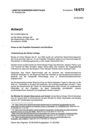 "content": "LANDTAG NORDRHEIN-WESTFALEN Drucksache 18/672 18. Wahlperiode 25.08.2022 Antwort der Landesregierung auf die Kleine Anfrage 195 des Abgeordneten Klaus Esser AfD Drucksache 18/286 Chaos an den Flughäfen Düsseldorf und Köln/Bonn Vorbemerkung der Kleinen Anfrage Bereits am frühen Morgen des 27. Juni 2022 wurde von zahlreichen Nachrichtenmagazinen wie Focus berichtet, dass es z. B. am Flughäfen Düsseldorf aufgrund von Personalmangel der 1 Dienstleister im Abfertigungsprozess zu sehr langen Wartezeiten kam. Darüber hinaus wurden bereits am frühen Morgen Flüge nach München, Istanbul, Palma, Lyon und Frankfurt am Main annulliert. Gegen Abend teilte unter anderem die Fluggesellschaft Lufthansa mit, dass sich die Situation in den nächsten Wochen kaum verbessern wird. Gegenüber dem Kölner Stadt-Anzeiger gab ein Sprecher des Verkehrsministeriums Nordrhein-Westfalen an, die Regierung habe sich mehrfach an das Bundesinnenministerium gewandt und die mangelnde Personallage auch in Verkehrsministerkonferenzen 2 angesprochen. Der Bundesverkehrsminister Wissing schlug am Abend desselben Tages im Interview mit der Welt vor, „Fachkräfte im Ausland [zu] gewinnen, die kurzfristig einspringen könnten“ . Dazu 3 warnte die Gewerkschaft der Polizei vor Sicherheitsrisiken beim Einsatz von ausländischen Hilfskräften an den Flughäfen, da diese Arbeitskräfte grundsätzlich „intensiv sicherheitstechnisch überprüft und eingewiesen werden müssen“ . 4 Der Minister für Umwelt, Naturschutz und Verkehr hat die Kleine Anfrage 195 mit Schreiben vom 22. August 2022 im Einvernehmen mit dem Minister für Arbeit, Gesundheit und Soziales namens der Landesregierung beantwortet. 1 Vgl. https://www.focus.de/panorama/welt/urlaubschaos-im-newsticker-bundesregierung-holt- hilfskraefte-aus-dem-ausland-um-flughafen-chaos-zu-baendigen_id_107989525.html, abgerufen am 27.06.2022 um 11:37 Uhr 2 Vgl. https://www.ksta.de/politik/-handlungsbedarf-angemahnt--landesregierung-weist-schuld-bei- flughafen-chaos-von-sich-39779984, abgerufen am 27.06.2022 um 19:41 Uhr 3 https://www.welt.de/politik/deutschland/video239601561/Chaos-am-Flughafen-Verkehrsminister- Wissing-zum-Einsatz-tuerkischer-Leiharbeiter.html, abgerufen am 27.06.2022 um 19:43 Uhr. 4 Vgl. https://ga.de/news/panorama/polizeigewerkschaft-warnt-vor-sicherheitsrisiken-an- flughaefen_aid-71996317, abgerufen am 27.06.2022 um 19:56 Uhr Datum des Originals: 22.08.2022/Ausgegeben: 31.08.2022",