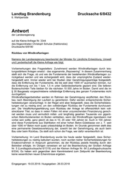 "content": "Landtag Brandenburg Drucksache 6/8432 6. Wahlperiode Antwort der Landesregierung auf die Kleine Anfrage Nr. 3344 des Abgeordneten Christoph Schulze (fraktionslos) Drucksache 6/8190 Rückbau von Windkraftanlagen Namens der Landesregierung beantwortet der Minister für Ländliche Entwicklung, Umwelt und Landwirtschaft die Kleine Anfrage wie folgt: Vorbemerkungen des Fragestellers: Zunehmend werden Windkraftanlagen durch leis- tungsstärkere Anlagen ersetzt - das sogenannte „Repowering“. In diesem Zusammenhang stellt sich die Frage, ob und wie die Fundamente der bestehenden Windkraftanlagen zu- rückgebaut werden und wie sichergestellt wird, dass der ursprüngliche Zustand wieder- hergestellt wird. Immer wieder wird bei Studien über Genehmigungsanträge festgestellt, dass die Entfernung der Fundamente, die bis weit über 1000 m³ ausmachen können, nur die Entfernung von bis 1 bzw. 1,5 m unter Geländeoberkante geplant sind. Die tieferen Bodenschichten Teile bleiben für die nächsten 10 000 Jahre im Boden. Damit wird die im § 35 Baugesetz vorgeschriebene vollständige Entfernung des ganzen Fundamentes nicht durchgeführt. Windkraftanlagenbetreiber werden im Rahmen der Genehmigung verpflichtet, den Rück- bau nach Beendigung der Laufzeit zu garantieren. Dafür werden entsprechende Sicher- heitsleistungen veranschlagt. In der Regel wird aber festgestellt, dass die Sicherheitsleis- tungen viel zu niedrig sind, um den vollständigen Rückbau der Fundamente durchzuset- zen. Die Verpflichtungserklärung zum Rückbau der Anlage ist offensichtlich kein voll- streckbarer Titel, so dass in vielen Fällen mit einer unzureichenden Finanzierung gerech- net werden muss und vermutlich mittel- und langfristig gesehen Tausende von giganti- schen Betonfundamenten im Boden verbleiben, wenn der Windkrafthype irgendwann mal vorbei sein sollte, ganz gleich ob das in 10, 20 oder 100 Jahren ist. Auch in 100 Jahren sind diese Fundamente aus Stahlbeton mit einer hohen Beton-Güteklasse von z. T. weit über 1000 m³ Beton noch quasi unbeschädigt im Boden. Im Grunde genommen stellt dies eine permanente Gesetzesverletzung dar, sowohl bei der Genehmigung, als auch beim Bau oder beim Rückbau. Da stellt sich schon die Frage, wer dafür verantwortlich ist. Vorbemerkung: Im Land Brandenburg wurde bis heute weder festgestellt, dass Sicher- heitsleistungen zu niedrig kalkuliert wurden, noch wurden bisher Sicherheitsleistungen für Ersatzvornahmen in Anspruch genommen, da der Rückbau jeweils freiwillig durch den Betreiber erfolgte. Im Übrigen verweisen wir auf die Beantwortung der Großen Anfrage Nr. 5 (Landtagsdrucksache 6/1319) und der Kleinen Anfrage Nr. 64 (Landtagsdrucksache 6/334). Es haben sich gegenüber dem Kenntnisstand zum Zeitpunkt der Beantwortung keine wesentlichen neuen Erkenntnisse ergeben. Eingegangen: 19.03.2018 / Ausgegeben: 26.03.2018",