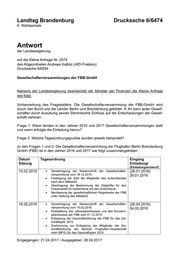 "content": "Landtag Brandenburg Drucksache 6/6474 6. Wahlperiode Antwort der Landesregierung auf die Kleine Anfrage Nr. 2578 des Abgeordneten Andreas Kalbitz (AfD-Fraktion) Drucksache 6/6284 Gesellschafterversammlungen der FBB-GmbH Namens der Landesregierung beantwortet der Minister der Finanzen die Kleine Anfrage wie folgt: Vorbemerkung des Fragestellers: Die Gesellschafterversammlung der FBB-GmbH wird durch den Bund und die Länder Berlin und Brandenburg gebildet. In ihr kann jeder Gesell- schafter durch Ausübung seines Stimmrechts Einfluss auf die Entscheidungen der Gesell- schaft nehmen. Frage 1: Wann fanden in den Jahren 2016 und 2017 Gesellschafterversammlungen statt und wann erfolgte die Einladung hierzu? Frage 2: Welche Tagesordnungspunkte wurden jeweils behandelt? zu den Fragen 1 und 2: Die Gesellschafterversammlung der Flughafen Berlin Brandenburg GmbH (FBB) ist in den Jahren 2016 und 2017 wie folgt zusammengetreten: Datum Tagesordnung Eingang Sitzung Einladung/ (Einladungsentwurf) 15.02.2016 Genehmigung der Niederschrift der Gesellschafter- (26.01.2016) versammlung vom 18.12.2015 29.01.2016 Festlegung der Zahl der Mitglieder des Aufsichtsrates nach dem MitbestG Übertragung der Bestimmung der Zielgröße für den Frauenanteil im Aufsichtsrat auf den Aufsichtsrat Neufassung der gesellschaftlichen Regelwerke der FBB unter Geltung des MitbestG 18.05.2016 Genehmigung der Niederschrift der Gesellschafter- (26.04.2016) versammlung vom 15.02.2016 04.05.2016 Feststellung des Jahresabschlusses und des Konzern- abschlusses der FBB zum 31.12.2015 Entlastung der Geschäftsführung der FBB für das Ge- schäftsjahr 2015 Zustimmung zur Entlastung der Mitglieder der Ge- schäftsführung der Berliner Flughafen-Gesellschaft mbH (BFG) für das Geschäftsjahr 2015 Eingegangen: 21.04.2017 / Ausgegeben: 26.04.2017",