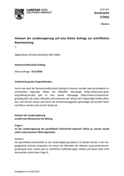"content": "18.06.2021 Drucksache 7/7832 öffentlich Antwort der Landesregierung auf eine Kleine Anfrage zur schriftlichen Beantwortung – Abgeordnete Christina Buchheim (DIE LINKE) Gemeinschaftsschule Gröbzig Kleine Anfrage ‐ KA 7/4594 Vorbemerkung des Fragestellenden: Sucht man nach der Gemeinschaftsschule Gröbzig im Internet, werden zwei verschiedene In‐ ternetseiten angezeigt. Neben der offiziellen Homepage (https://www.gms‐groe‐ bzig.bildung‐lsa.de/) gibt es eine zweite Homepage (http://www.schulzentrum‐ groebzig.de/), die neben offiziellen Informationen der Schule sehr fragwürdige Inhalte offen‐ bart. Der Ruf der Schule wird durch die Verwechslungsgefahr geschädigt und Schüler*innen und Eltern wenden sich von der Schule ab. Antwort der Landesregierung erstellt vom Ministerium für Bildung Frage 1: Ist der Landesregierung der geschilderte Sachverhalt bekannt? Wenn ja, warum wurde nichts unternommen? Bitte begründen. Antwort: Der geschilderte Sachverhalt ist der Landesregierung bekannt. Es fanden bereits in der Ver‐ gangenheit mehrere Gespräche mit einem der Betreiber der Website www.schulzentrum‐ groebzig.de statt. Zudem gab es schriftliche Aufforderungen, Inhalte auf dieser Seite nicht darzustellen (siehe dazu Frage 3). (Ausgegeben am 18.06.2021)",