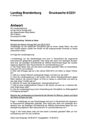 "content": "Landtag Brandenburg Drucksache 6/2231 6. Wahlperiode Antwort der Landesregierung auf die Kleine Anfrage 842 der Abgeordneten Birgit Bessin AfD-Fraktion Drucksache 6/1986 Homeschooling / Schule zu Haus Wortlaut der Kleinen Anfrage 842 vom 08.07.2015 Unabhängig von der staatlichen Schulpflicht gibt es immer wieder Eltern, die nach dem Vorbild anderer Länder ihre Kinder mit der entsprechenden Kontrolle zu Hause unterrichten wollen. Ich frage die Landesregierung: 1.)Unabhängig von der Gesetzeslage wird auch in Deutschland der sogenannte Hausunterricht gelegentlich geduldet. Dies hängt sehr stark vom jeweiligen Bundes- land, bzw. der jeweiligen Schulbehörde ab. Welche Erkenntnisse liegen der Landes- regierung allgemein über Hausunterricht im Land Brandenburg vor? 2.) Wo findet dieser statt und wird damit zumindest geduldet? Bitte um Aufschlüsse- lung nach Ort und Landkreis. 3.) Wie viele Anfragen gab es in den Jahren 2004-2014 von Eltern zu dieser Thema- tik? 4.) Gibt es in diesem Bereich anhängende Klagen und wenn ja, wie viele? 5.) Sind der Landesregierung in den letzten zehn Jahren Zwangsmaßnamen gegen Eltern bekannt, die versucht haben, ihr Kind zu Hause zu unterrichten und wenn ja, wie viele dieser Vorfälle gab es? 6.) Welcher Art waren die eingesetzten Zwangsmaßnahmen? 7.) Gibt es einen ergebnisoffenen Diskurs in der Sache und wenn ja, in welchem Be- reich findet dieser statt? 8.) Hat die Landesregierung je eine Umwandlung der Schulpflicht zur Bildungspflicht in Erwägung gezogen? Namens der Landesregierung beantwortet der Minister für Bildung, Jugend und Sport die Kleine Anfrage wie folgt: Frage 1: Unabhängig von der Gesetzeslage wird auch in Deutschland der sogenann- te Hausunterricht gelegentlich geduldet. Dies hängt sehr stark vom jeweiligen Bun- desland, bzw. der jeweiligen Schulbehörde ab. Welche Erkenntnisse liegen der Lan- desregierung allgemein über Hausunterricht im Land Brandenburg vor? Frage 2: Wo findet dieser statt und wird damit zumindest geduldet? Bitte um Auf- schlüsselung nach Ort und Landkreis.",