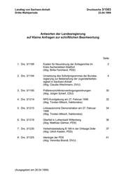 "content": "Landtag von Sachsen-Anhalt Drucksache 3/1503 Dritte Wahlperiode 23.04.1999 Antworten der Landesregierung auf Kleine Anfragen zur schriftlichen Beantwortung Seite 1. Drs. 3/1189 Kosten für Neuordnung der Amtsgerichte im 2 Kreis Aschersleben-Staßfurt (Abg. Britta Ferchland, PDS) 2. Drs. 3/1194 Umsetzung des Sofortprogrammes der Bundes- 4 regierung zur Bekämpfung der Jugendarbeitslo- sigkeit in Sachsen-Anhalt (Abg. Claudia Wiechmann, DVU) 3. Drs. 3/1195 Präferenzrichtlinienverdingungsordnungen 30 (Abg. Jürgen Scharf, CDU) 4. Drs. 3/1214 NPD-Kundgebung am 27. Februar 1999 32 (Abg. Torsten Miksch, fraktionslos) 5. Drs. 3/1215 Linksautonome Demonstration am 27. Februar 34 1999 (Abg. Torsten Miksch, fraktionslos) 6. Drs. 3/1218 Überfall in Lutherstadt Wittenberg 36 (Abg. Matthias Gärtner, PDS) 7. Drs. 3/1230 Verkehrsbelastung B 189 in der Ortlsage Dolle 37 (Abg. Ulrich Kasten, PDS) 8. Drs. 3/1325 Ideologie der PDS 41 (Abg. Veronika Brandt, DVU) (Ausgegeben am 26.04.1999)",