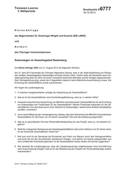 "content": "Thüringer Landtag 5. Wahlperiode Drucksache 5/ 6777 16.10.2013 Kleine Anfrage der Abgeordneten Dr. Scheringer-Wright und Kuschel (DIE LINKE) und Antwort des Thüringer Innenministeriums Solaranlagen im Gewerbegebiet Rastenberg Die Kleine Anfrage 3346 vom 21. August 2013 hat folgenden Wortlaut: Am 27. April 2013 berichtete die Thüringer Allgemeine Zeitung, dass in der Stadt Rastenberg auf Flächen des dortigen Gewerbegebiets Solaranlagen errichtet werden sollen. Hierfür habe die Gemeinde einen Ge- stattungsvertrag über 25 Jahre mit einem namentlich benannten Betreiber solcher Anlagen abgeschlossen. Dem Vertragsschluss ging, soweit den Fragestellern bekannt, keine öffentliche Ausschreibung voraus. Die Errichtung der Gewerbefläche wurde subventioniert. Wir fragen die Landesregierung: 1. In welchem Vergabeverfahren erfolgte die Verpachtung der Gewerbefläche? 2. Gab es für die Gewerbeflächen eine Erschließungsförderung, wenn ja, in welcher Höhe? 3. Inwieweit entspricht eine Verpachtung von öffentlich subventionierten Gewerbeflächen für die Errichtung von Solaranlagen den Förderzielen für die Gewerbefläche? Welche Förderziele bestanden für die Ge- werbeflächen und sind diese durch einen Standort für Solaranlagen, welche keine direkten Arbeitsplätze schaffen, erreichbar? 4. Ist es nach Auffassung der Landesregierung zulässig, dass eine Gemeinde eine öffentlich subventionierte Gewerbefläche für die Dauer von 25 Jahren verpachtet? Wie wird die Auffassung begründet? 5. Gab es im geschilderten Fall eine Wirtschaftlichkeitsprüfung für das Projekt, wenn ja, mit welchem Er- gebnis? 6. Stellt die vorliegende Überlassung der Gewerbegebietsflächen über einen Zeitraum von 25 Jahren einen für die Gemeinde wirtschaftlichen Vorteil dar? 7. Wie hoch sind für die Gemeinde die Einnahmen aus Pacht und Steuern durch das Vertragsverhältnis und durch die auf den Grundstücken betriebenen Anlagen, und welche von bereits aufgewandten und noch anfallenden Erschließungskosten für die Gewerbefläche stehen diesen Einnahmen gegenüber? 8. Wie bewertet die Landesregierung, dass der Gestattungsvertrag möglicherweise ohne Durchführung einer Ausschreibung erfolgte? Gab es für die Realisierung des Projekts der Photovaltaikanlage weitere Interessenten? Druck: Thüringer Landtag, 28. Oktober 2013",