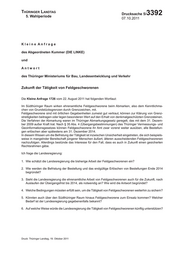 "content": "Thüringer Landtag 5. Wahlperiode Drucksache 5/ 3392 07.10.2011 Kleine Anfrage des Abgeordneten Kummer (DIE LINKE) und Antwort des Thüringer Ministeriums für Bau, Landesentwicklung und Verkehr Zukunft der Tätigkeit von Feldgeschworenen Die Kleine Anfrage 1726 vom 22. August 2011 hat folgenden Wortlaut: Im Südthüringer Raum wirken ehrenamtliche Feldgeschworene beim Abmarken, also dem Kenntlichma- chen von Grundstücksgrenzen durch Grenzzeichen, mit. Feldgeschworene sind mit örtlichen Gegebenheiten zumeist gut vertraut, können zur Klärung von Grenz- streitigkeiten beitragen oder legen besonderen Wert auf den Erhalt von denkmalgeschützten Grenzsteinen. Die Verfahren der Abmarkung waren im Thüringer Abmarkungsgesetz geregelt, das mit dem 31. Dezem- ber 2009 außer Kraft trat. Nach § 35 Abs. 4 (Übergangsbestimmungen) des Thüringer Vermessungs- und Geoinformationsgesetzes können Feldgeschworene ihr Amt zwar vorerst weiter ausüben, alle Bestellun- gen erlöschen aber spätestens am 31. Dezember 2014. In diesem Wissen um die Befristung der Tätigkeit ist inzwischen Unsicherheit eingetreten, die sich beispiels- weise in mangelnder Bereitschaft jüngerer Menschen äußert, älteren ausscheidenden Feldgeschworenen nachzufolgen. Allerdings bestünde das Interesse für den Fall, dass es auch in Zukunft einen gesicherten Rechtsrahmen gäbe. Ich frage die Landesregierung: 1. Wie schätzt die Landesregierung die bisherige Arbeit der Feldgeschworenen ein? 2. Wie werden die Befristung der Bestellung und das endgültige Erlöschen von Bestellungen Ende 2014 begründet? 3. Sieht die Landesregierung die ehrenamtliche Arbeit von Feldgeschworenen auch für die Zukunft, nach Auslaufen der Übergangsfrist bis 2014, als notwendig an? Wie wird die Antwort begründet? 4. Welche Bedingungen müssten erfüllt sein, um die Tätigkeit von Feldgeschworenen weiterhin zu sichern? 5. Könnten auch über den Südthüringer Raum hinaus Feldgeschworene zum Einsatz kommen? Welcher Bedarf ist der Landesregierung gegebenenfalls bekannt? 6. Auf welche Weise würde die Landesregierung die Tätigkeit von Feldgeschworenen künftig unterstützen? Druck: Thüringer Landtag, 19. Oktober 2011",