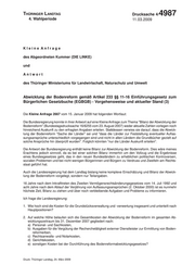 "content": "THÜRINGERLandtag Thüringer LANDTAG - 4. Wahlperiode Drucksache 4/ 4987 4. Wahlperiode 11.03.2009 Kleine Anfrage des Abgeordneten Kummer (DIE LINKE) und Antwort des Thüringer Ministeriums für Landwirtschaft, Naturschutz und Umwelt Abwicklung der Bodenreform gemäß Artikel 233 §§ 11-16 Einführungsgesetz zum Bürgerlichen Gesetzbuche (EGBGB) - Vorgehensweise und aktueller Stand (3) Die Kleine Anfrage 2667 vom 15. Januar 2009 hat folgenden Wortlaut: Die Bundesregierung konnte in ihrer Antwort auf eine Kleine Anfrage zum Thema \"Bilanz der Abwicklung der Bodenreform\" (Bundestagsdrucksache 16/6255 vom 23. August 2007) weder aktuelle Zahlen vorlegen noch hinreichend Auskunft zu den erfragten Angaben erteilen. Stattdessen verwies sie darauf, dass die Abwick- lung der Bodenreform \"Sache der Länder\" sei und \"dass die Länder zur Feststellung eventueller Auflas- sungsansprüche unterschiedlich vorgegangen sind und nicht in allen Ländern die Grundbücher gezielt auf solche Ansprüche hin überprüft wurden\". Folglich könnten \"nur die Länder Auskunft erteilen\". Die Antwort der Bundesregierung enthält keine Bilanz zur Abwicklung der Bodenreform. Dies wäre meines Erachtens jedoch sinnvoll, da es bei einer solchen Bilanz immerhin um den Vollzug und die Ergebnisse eines Bundesgesetzes geht, das in den neuen Bundesländern zu erheblichen politischen Kontroversen, sozialen Problemen und bei nicht wenigen Bürgerinnen und Bürgern zu Verdruss und Zweifeln am Rechts- staat geführt hat. Auch die Landesregierung hat dem Landtag bislang keine komplexe Einschätzung und Bilanz der Abwick- lung der Bodenreform vorgelegt, sondern nur Teilangaben. 16 Jahre nach dem Inkrafttreten des Zweiten Vermögensrechtsänderungsgesetzes vom 14. Juli 1992 und acht Jahre nach dem Ablauf der Verjährung von Auflassungsansprüchen (2. Oktober 2000) ist es nunmehr höchste Zeit, Bilanz zu ziehen und über noch verbleibende Aufgaben und Probleme zu informieren. Ich frage die Landesregierung: 1. Wie hoch sind die Kosten für die Grundstücksverwaltung und -verwertung insgesamt und unterteilt nach Hauptpositionen? 2. Auf welche Höhe belaufen sich die Gesamtkosten der Abwicklung der Bodenreform im gesamten Ab- wicklungszeitraum bis 31. Dezember 2007 gegliedert nach: a) Personal- und Sachkosten, b) Ausgaben für die Vergütung der Recherchetätigkeit externer Dienstleister zur Ermittlung von Boden- reformerben, c) Rechtsanwalts- und Notarkosten, d) Gerichtskosten, e) sonstigen Kosten bei der Durchführung des Bodenreformabwicklungsgesetzes? Druck: Thüringer Landtag, 24. März 2009 1",