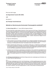 "content": "THÜRINGERLandtag Thüringer LANDTAG - 4. Wahlperiode Drucksache 4/ 4901 4. Wahlperiode 17.02.2009 Kleine Anfrage des Abgeordneten Kuschel (DIE LINKE) und Antwort des Thüringer Innenministeriums Methodik zur Berechnung des Kommunalen Finanzausgleichs zweifelhaft? Die Kleine Anfrage 2654 vom 7. Januar 2009 hat folgenden Wortlaut: Der Innenminister des Landes Sachsen-Anhalt hat in einem Interview auf die Frage zur Datenerhebung und -berechnung des Finanzbedarfs der Thüringer Kommunen geantwortet, dass \"eine Vollkostenerhebung keinen Sinn macht. Stattdessen haben wir uns mit den kommunalen Verbänden darauf verständigt, so etwas wie Warenkörbe zu bilden, etwa für die Ausgaben auf der Basis des Kinder- und Jugendhilfegesetzes. Es stellte sich heraus, dass etwa 90 Prozent der kommunalen Ausgaben mit solchen 'Körben' ermittelbar sind, nur der Rest muss durch Schätzung oder Rundung bestimmt werden.\" (Quelle: rathausconsult, Magazin für kom- munale Wirtschaftstätigkeit, Ausgabe Dezember/2008) Ich frage die Landesregierung: 1. Aufgrund welcher durch die Thüringer Landesregierung zur Verfügung gestellten Informationen und Da- ten musste die Landesregierung Sachsen-Anhalt zu der Einschätzung gelangen, dass eine Vollkosten- erhebung zur Ermittlung des kommunalen Finanzbedarfs keinen Sinn machen würde? 2. Welche weiterführenden Erläuterungen und zusätzlichen Erklärungen zur Methodik der Ermittlung des kommunalen Finanzbedarfs in Thüringen hat die Thüringer Landesregierung der Landesregierung Sach- sen-Anhalt gegeben? Aus welchen Gründen konnte dennoch die Landesregierung Sachsen-Anhalt nicht vom Sinn der Berechnungsmethodik ausreichend unterrichtet werden? 3. Inwieweit nimmt die Thüringer Landesregierung die Zweifel am Sinn der Berechnungsmethodik durch die Landesregierung Sachsen-Anhalt zum Anlass, die Berechnungsmethode zu erneuern? Was soll sich dabei möglicherweise an der Berechnungsmethode mit Blick auf die erforderliche Novellierung des Thü- ringer Finanzausgleichsgesetzes 2010 verändern? Wie begründet die Landesregierung ihre Auffassun- gen? Das Thüringer Innenministerium hat die Kleine Anfrage namens der Landesregierung mit Schreiben vom 16. Februar 2009 wie folgt beantwortet: Zu 1.: Die Thüringer Landesregierung ist nicht in den Entscheidungs- und Meinungsbildungsprozess der Landes- regierung Sachsen-Anhalt eingebunden, anhand welcher Kriterien bzw. Methodik die Höhe der Finanzaus- gleichsleistungen des Landes an die sachsen-anhaltinischen Kommunen bestimmt werden. Insofern ist es der Thüringer Landesregierung weder möglich, die zitierte Aussage des Innenministers des Landes Sach- sen-Anhalt zu bewerten, noch eine Aussage darüber zu treffen, worauf dessen Einschätzung beruht. Druck: Thüringer Landtag, 23. Februar 2009 1",