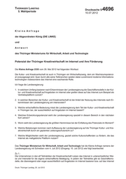"content": "Thüringer Landtag 5. Wahlperiode Drucksache 5/ 4696 10.07.2012 Kleine Anfrage der Abgeordneten König (DIE LINKE) und Antwort des Thüringer Ministeriums für Wirtschaft, Arbeit und Technologie Potenzial der Thüringer Kreativwirtschaft im Internet und ihre Förderung Die Kleine Anfrage 2335 vom 29. Mai 2012 hat folgenden Wortlaut: Die Kultur- und Kreativwirtschaft ist auch in Thüringen ein Wirtschaftszweig, dem ein Wachstumspotenzi- al vorausgesagt wird. Quer durch alle seine Teilbranchen spielen dabei zunehmend moderne Informations- technologien insbesondere das Internet eine wachsende Rolle. Ich frage die Landesregierung: 1. In welchem Umfang basieren nach Erkenntnissen der Landesregierung die Geschäftsmodelle in der Kul- tur- und Kreativwirtschaft auf Angeboten im Internet oder greifen diese auf das Internet zum Beispiel als Vertriebsplattform zurück? 2. In welchen Bereichen der Kultur- und Kreativwirtschaft ist der Anteil der Nutzung des Internets nach Er- kenntnissen der Landesregierung am intensivsten? 3. Welche wirtschaftliche Bedeutung misst die Landesregierung dem Teil der Kultur- und Kreativwirtschaft in Thüringen bei, der ausschließlich auf Angeboten im Internet basiert? 4. Welches Entwicklungspotenzial sieht die Landesregierung speziell in diesem Bereich in den nächsten fünf Jahren? 5. Worin sieht die Landesregierung die größten Hemmnisse bei der Entfaltung des Potenzials im Moment? 6. Welche Belastungen kommen nach Auffassung der Landesregierung auf die Thüringer Kultur- und Kre- ativwirtschaft durch ein geplantes Leistungsschutzrecht zu? 7. Welche Möglichkeiten sieht die Landesregierung, gezielt solche Kulturschaffenden zu fördern, die das Internet als maßgebliche Plattform nutzen? Das Thüringer Ministerium für Wirtschaft, Arbeit und Technologie hat die Kleine Anfrage namens der Landesregierung mit Schreiben vom 4. Juli 2012 (Eingang: 10. Juli 2012) wie folgt beantwortet: Zu 1.: Die Unternehmen in den elf Teilmärkten der Kreativwirtschaft nutzen das Internet in unterschiedlicher Wei- se und Intensität für die eigene wirtschaftliche Betätigung. In jedem der Teilmärkte gibt es Geschäftsmo- delle, die überwiegend oder sogar ausschließlich auf Angeboten im Internet basieren bzw. auf das Internet Druck: Thüringer Landtag, 20. Juli 2012",