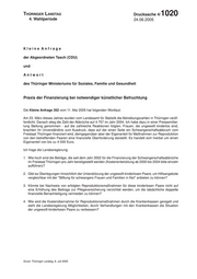 "content": "THÜRINGERLandtag Thüringer LANDTAG - 4. Wahlperiode Drucksache 4/ 1020 4. Wahlperiode 24.06.2005 Kleine Anfrage der Abgeordneten Tasch (CDU) und Antwort des Thüringer Ministeriums für Soziales, Familie und Gesundheit Praxis der Finanzierung bei notwendiger künstlicher Befruchtung Die Kleine Anfrage 352 vom 11. Mai 2005 hat folgenden Wortlaut: Am 23. März dieses Jahres wurden vom Landesamt für Statistik die Abtreibungszahlen in Thüringen veröf- fentlicht. Danach stieg die Zahl der Abbrüche auf 4 757 im Jahr 2004. Ich habe dazu in einer Pressemittei- lung Stellung genommen - auf die zahlreiche Reaktionen folgten. Frauen, die ungewollt kinderlos sind, brachten ihr Unverständnis zum Ausdruck, dass auf der einen Seite ein Schwangerschaftsabbruch vom Freistaat Thüringen finanziert wird, demgegenüber aber der Eigenanteil für Maßnahmen zur Reproduktion von den betreffenden Paaren eine finanzielle Überforderung darstellt. Es handelt sich hierbei um einen Eigenanteil von bis zu 4 000 Euro. Ich frage die Landesregierung: 1. Wie hoch sind die Beträge, die seit dem Jahr 2002 für die Finanzierung der Schwangerschaftsabbrüche im Freistaat Thüringen pro Jahr bereitgestellt werden (Kostenentwicklung ab 2000 bis 2004 bitte einzeln aufführen)? 2. Gibt es Überlegungen hinsichtlich der Unterstützung der ungewollt kinderlosen Paare, um Hilfsangebote vergleichbar mit der \"Stiftung für schwangere Frauen und Familien in Not\" anbieten zu können? 3. Könnte bei Nachweis von erfolgten Reproduktionsmaßnahmen für diese kinderlosen Paare nicht auf eine Erhöhung des Beitrags zur Pflegeversicherung verzichtet werden, um die tatsächliche doppelte finanzielle Benachteiligung vermeiden zu können? 4. Wie wird die Kostenübernahme für Reproduktionsmaßnahmen durch die Krankenkassen geregelt und sieht die Landesregierung Möglichkeiten, durch Verhandlungen mit den Krankenkassen die Situation der ungewollt kinderlosen Paare zu verbessern? Druck: Thüringer Landtag, 6. Juli 2005 1",