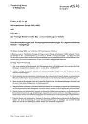 "content": "Thüringer Landtag 5. Wahlperiode Drucksache 5/ 6970 02.12.2013 Kleine Anfrage der Abgeordneten Stange (DIE LINKE) und Antwort des Thüringer Ministeriums für Bau, Landesentwicklung und Verkehr Schulbauempfehlungen mit Raumprogrammempfehlungen für allgemeinbildende Schulen - nachgefragt Die Kleine Anfrage 3454 vom 8. Oktober 2013 hat folgenden Wortlaut: In Beantwortung der Mündlichen Anfrage der Abgeordneten Stange (Drucksache 5/4492) teilte der Thürin- ger Minister für Bau, Landesentwicklung und Verkehr in der 88. Landtagssitzung am 1. Juni 2012 mit, dass die Schulbauempfehlungen mit Raumprogrammempfehlungen für allgemeinbildende Schulen zeitnah über- arbeitet wird. Der Abstimmungsprozess mit den Schulträgern habe gerade begonnen. Ich frage die Landesregierung: 1. Wie ist der aktuelle Verfahrensstand der Überarbeitung der o.g. Empfehlungen, wann werden die Emp- fehlungen voraussichtlich erlassen und wo werden diese veröffentlicht? 2. Welche Thüringer Ministerien arbeiten mit welchen bisherigen Ergebnissen bzw. Entwürfen an den Schulbauempfehlungen? 3. Worin bestehen bei den räumlichen Anforderungen des Entwurfs/der Entwürfe des/der verantwortlichen Ministeriums/Ministerien die wesentlichen Unterschiede zu den bisherigen Schulbauempfehlungen? 4. Wann wurden die Schulträger über den Entwurf/die Entwürfe der Schulbauempfehlungen informiert und bis wann hatten diese Gelegenheit zur Stellungnahme? 5. Welche konkreten Hinweise und Änderungswünsche haben die Schulträger im Rahmen der Überarbeitung der Schulbauempfehlungen abgegeben und welche davon wurden in den Empfehlungen berücksichtigt? 6. Welche Vereine und Verbände der Vertreter von Menschen mit Behinderung haben an der Erarbeitung des Entwurfs/der Entwürfe der o.g. Empfehlungen mitgewirkt und welche konkreten Vorschläge wurden von Seiten dieser Vereine und Verbände abgegeben und welche davon in die Empfehlungen aufgenommen? 7. Falls die Vereine und Verbände der Vertreter für Menschen mit Behinderung bisher nicht die Möglichkeit hatten, sich an der Erarbeitung der neuen Schulbauempfehlungen zu beteiligen, was sind die Gründe dafür und wann ist eine Beteiligung dieser Vereine und Verbände vorgesehen? Druck: Thüringer Landtag, 2. Januar 2014",