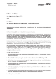 "content": "Thüringer Landtag 5. Wahlperiode Drucksache 5/ 4342 23.04.2012 Kleine Anfrage des Abgeordneten Koppe (FDP) und Antwort des Thüringer Ministeriums für Wirtschaft, Arbeit und Technologie Gesundheitsorientierte Selbstzahler - eine Chance für den Gesundheitsstandort Thüringen? Die Kleine Anfrage 2196 vom 5. März 2012 hat folgenden Wortlaut: Im Jahr 2009 haben vier Millionen Menschen in Deutschland einen \"Gesundheitsurlaub\" verbracht. Bis in das Jahr 2020 wird ein Anstieg auf etwa sieben Millionen prognostiziert. Fast 40 Prozent aller Urlauber wol- len in ihrem Urlaub etwas für ihr körperliches Wohlbefinden und ihre Gesundheit tun. Vor diesem Hinter- grund ergeben sich für die Gesundheits- und Tourismuswirtschaft große Entwicklungspotentiale, die es mit entsprechenden Angeboten auszuschöpfen gilt. Der Gesundheitstourismus ist ein Teil des überwiegend privatfinanzierten \"zweiten Gesundheitsmarktes\". Die Faktoren Fitness und Wohlbefinden, Erhaltung der eigenen Leistungsfähigkeit sowie der Minimierung gesundheitlicher Risiken rücken immer mehr in das Bewusstsein der Menschen. Die Verknüpfung der Gesundheitswirtschaft mit dem Tourismus bietet gerade für Kur- und Heilbäderor- te Wachstumschancen. Auch durch den demographischen Wandel können neue Zielgruppen erschlossen werden. Zentrale Aufgabe für den Tourismus ist die Bildung von Brücken und Kooperationen mit dem Ge- sundheitssektor. Die Einbindung touristischer Akteure und Strukturen in die Gesundheitswirtschaft ist Not- wendigkeit und Chance zugleich. Ich frage die Landesregierung: 1. Wie viele Urlauber haben in der Vergangenheit (Zeitraum 2000 bis 2011) in Thüringen einen \"Gesund- heitsurlaub\" verbracht? 2. Wie schätzt die Landesregierung das Potential des Gesundheitstourismus für Thüringen ein? 3. Welche Maßnahmen hat die Landesregierung in der Vergangenheit ergriffen bzw. ergreift die Landesre- gierung, um dieses Potential auszuschöpfen? 4. Inwieweit unterstützt die Landesregierung die Tourismuswirtschaft dabei, Kooperationen mit der Gesund- heitswirtschaft einzugehen? 5. Inwieweit unterstützt die Landesregierung die Einbindung touristischer Akteure und Strukturen in die Ge- sundheitswirtschaft? 6. Inwieweit sensibilisiert die Landesregierung insbesondere Kurorte und Rehakliniken für den verstärkten Bedarf der zielgruppenorientierten Werbung für gesundheitsorientierte Selbstzahler? Druck: Thüringer Landtag, 2. Mai 2012",