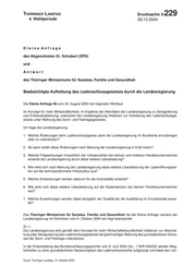 "content": "THÜRINGERLandtag Thüringer LANDTAG - 4. Wahlperiode Drucksache 4/ 229 4. Wahlperiode 08.10.2004 Kleine Anfrage des Abgeordneten Dr. Schubert (SPD) und Antwort des Thüringer Ministeriums für Soziales, Familie und Gesundheit Beabsichtigte Aufhebung des Ladenschlussgesetzes durch die Landesregierung Die Kleine Anfrage 60 vom 24. August 2004 hat folgenden Wortlaut: Im Konzept für mehr Wirtschaftlichkeit, im Ergebnis der Aktivitäten der Landesregierung zu Deregulierung und Entbürokratisierung, unterstützt die Landesregierung Initiativen zur Aufhebung des Ladenschlussge- setzes unter Wahrung des Sonn- und Feiertagsgesetzes. Ich frage die Landesregierung: 1. Welche Änderungen beim Ladenschlussgesetz plant die Landesregierung im Bundesrat einzubringen oder zu unterstützen? 2. Ab wann sollen diese Änderungen nach Meinung der Landesregierung in Kraft treten? 3. Welche Folgewirkungen hinsichtlich der Umsatzzahlen bei kleinen und mittleren Handelsunternehmen erwartet die Landesregierung durch diese weitere Liberalisierung? 4. Wie wirkt sich nach Meinung der Landesregierung diese weitere Liberalisierung der Ladenöffnungszei- ten auf die wohnstandortnahe Infrastruktur aus? 5. Welche Entwicklungen werden dadurch für die Innenstädte erwartet? 6. Wie wirkt sich diese weitere Liberalisierung auf die Kostenstruktur bei kleinen Familienunternehmen aus? 7. Welche Auswirkungen werden dabei bezüglich der Qualität bei der Ausbildung im Einzelhandel erwar- tet? Das Thüringer Ministerium für Soziales, Familie und Gesundheit hat die Kleine Anfrage namens der Landesregierung mit Schreiben vom 6. Oktober 2004 wie folgt beantwortet: Zu 1.: Die Landesregierung wird gemäß dem Konzept für mehr Wirtschaftsfreundlichkeit Initiativen zur Abschaf- fung oder Deregulierung des Ladenschlussgesetzes bei gleichzeitiger Wahrung des grundsätzlichen Schut- zes der Sonn- und Feiertage unterstützen. In der Entscheidung des Bundesverfassungsgerichts vom 9. Juni 2004 (Az.: 1 BvR 636/02) werden Mög- lichkeiten zu einer grundsätzlichen Neukonzeption des Ladenschlussrechts aufgezeigt und dabei den Län- Druck: Thüringer Landtag, 19. Oktober 2004 1",