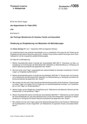 "content": "THÜRINGERLandtag Thüringer LANDTAG - 4. Wahlperiode Drucksache 4/ 1305 4. Wahlperiode 27.10.2005 Kleine Anfrage des Abgeordneten Dr. Pidde (SPD) und Antwort des Thüringer Ministeriums für Soziales, Familie und Gesundheit Förderung zur Eingliederung von Menschen mit Behinderungen Die Kleine Anfrage 511 vom 1. September 2005 hat folgenden Wortlaut: Im Landeshaushalt für das laufende Haushaltsjahr ist es zu erheblichen Kürzungen bei der Förderung der Eingliederung behinderter Menschen gekommen. Darüber hinaus drohen weitere Kürzungen durch Haus- haltssperren und die vorgesehene globale Minderausgabe. Ich frage die Landesregierung: 1. Welche Haushaltsmittel stehen innerhalb des Haushaltstitels 0822 893 01 \"Zuschüsse zum Bau, zur Ausstattung von Einrichtungen der Behindertenhilfe\" tatsächlich zur Bewirtschaftung zur Verfügung und welche Reduzierung bedeutet das gegenüber dem Vorjahr? 2. Wie hoch ist der unter Frage 1 angemeldete bzw. bekannte Bedarf an derartigen Investitionen in Einrich- tungen zur Eingliederung Behinderter? 3. Welche Haushaltsmittel stehen innerhalb des Haushaltstitels 0822 684 74 \"Zuweisungen und Zuschüs- se für Maßnahmen der Behindertenhilfe\" tatsächlich zur Bewirtschaftung zur Verfügung und welche Re- duzierung bedeutet das gegenüber dem Vorjahr? 4. Wie verteilen sich die unter Frage 3 genannten Bewirtschaftungsmittel auf die Positionen \"Zuwendungen an andere Träger zum Aufbau und zur Förderung von familienentlastenden Diensten\" und \"Zuwendun- gen an freie Träger von Beratungsstellen\"? 5. Welche Folgen hat der Wegfall der Landesförderung für \"Maßnahmen des Betreuten Wohnens der Be- hindertenhilfe\" für die betroffenen Träger? 6. Welche Haushaltsmittel stehen innerhalb des Haushaltstitels 0829 684 71 \"Maßnahmen auf dem Gebiet der Gesundheitsförderung, des Gesundheitsschutzes und der Gesundheitshilfen\" tatsächlich zur Bewirt- schaftung zur Verfügung und welche Reduzierung bedeutet das gegenüber dem Vorjahr? 7. Wie verteilen sich die unter Frage 6 genannten Bewirtschaftungsmittel auf die Positionen \"Maßnahmen der Suchtprävention und der Drogenhilfe\" und \"Maßnahmen für psychisch Kranke und seelisch Behin- derte\"? Druck: Thüringer Landtag, 8. November 2005 1",