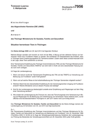 "content": "Thüringer Landtag 5. Wahlperiode Drucksache 5/ 7956 04.07.2014 Kleine Anfrage des Abgeordneten Ramelow (DIE LINKE) und Antwort des Thüringer Ministeriums für Soziales, Familie und Gesundheit Situation herrenloser Tiere in Thüringen Die Kleine Anfrage 3939 vom 28. April 2014 hat folgenden Wortlaut: Mehrere Bürger wandten sich kürzlich an mich mit der Bitte, in Bezug auf den stärkeren Schutz von her- renlosen Tieren bzw. Fundtieren initiativ zu werden. Sie schilderten mir beispielsweise das Problem, dass in Thüringen keine Unterbringungspflicht für Tierheime existiert. Zudem seien diese zumeist finanziell nicht in der Lage, diese Tiere aufnehmen zu können. Eine \"Gemeinsame Empfehlung des Thüringer Innenministeriums (TIM) und des Thüringer Ministeriums für Soziales, Familie und Gesundheit (TMSFG)\" sei nicht mehr in Kraft und eine überarbeitete Fassung wür- de noch nicht vorliegen. Ich frage die Landesregierung: 1. Wann und warum wurde die \"Gemeinsame Empfehlung des TIM und des TMSFG zur Verwahrung und Betreuung von Fundtieren\" außer Kraft gesetzt? 2. Wann und auf welche Weise ist die Außerkraftsetzung den Thüringer Gemeinden mitgeteilt worden? 3. Welchen Stand hat eine überarbeitete Empfehlung für den tierschutzgerechten Umgang mit Fundtieren erreicht? Welche Ministerien sind an diesem Prozess wie beteiligt? 4. Sind für die Landesregierung diesbezüglich anstelle einer Empfehlung auch Regelungen auf dem Weg einer Verordnung denkbar? 5. Wie schätzt die Landesregierung die Chancen ein, dass das Tierschutzgesetz eine Verbesserung in Be- zug auf Regelungen für die Betreuung und Unterbringung von herrenlosen Tieren erfahren kann, zumal offenbar eine Bundesratsinitiative Thüringens im Jahr 2011 bisher nicht zum Erfolg führte? Das Thüringer Ministerium für Soziales, Familie und Gesundheit hat die Kleine Anfrage namens der Landesregierung mit Schreiben vom 30. Juni 2014 wie folgt beantwortet: Zu 1.: Die \"Gemeinsame Empfehlung des Thüringer Innenministeriums und des Thüringer Ministeriums für So- ziales, Familie und Gesundheit zur Verwahrung und Betreuung von Fundtieren\" vom 22. November 1999 (ThürStAnz 2000, S. 54-55) ist im Zuge der Verwaltungsmodernisierung (Verfahren der Landesregierung zur Prüfung des Bestandes der Verwaltungsvorschriften) am 29. Dezember 2003 außer Kraft getreten. Druck: Thüringer Landtag, 22. Juli 2014",