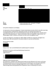 "content": "Seite5von 7\n\nAllgemeine Informationen\n\n1. AZR-Mitteilungen elektronisch erhalten\n\nWir möchten nochmals auf die Möglichkeit des elektronischen Nachrichtenversands der Nach-\nberichtserstattung nach $ 38 AZRG hinweisen.\n\nStellen, die sich für einen elektronischen Versand per E-Mail interessieren, können sich an das\n\nDa eine Verschlüsselung elektronisch versandter AZR-Mitteilungen bei der Vielzahl der nutzen-\nden Behörden aktuell nicht leistbar ist, kann der Mailversand derzeit nur für Stellen angeboten\nwerden, welche an den sicheren, zentralen E-Mail-Dienst des Verbindungsnetzes (Verbindung\nder informationstechnischen Netze des Bundes und der Länder; NdB-VN; vgl. IT-NetzG) ange-\nbunden sind. Ob eine solche Anbindung Ihrer Behörde besteht, kann durch einen Aufruf der Seite\n\nweraen.\n\nFalls ein Aufruf der Seite nicht möglich ist, sollten Sie mit Ihrer Technikabteilung Rücksprache\nhalten, ob ein entsprechender Zugang Ihrer Behörde zum NdB-VN besteht.\n\nAuf der Seite selber, im Reiter „Administratoren“, befinden sich sog. „Mailertables“, welche alle\nüber das Verbindungsnetz sicher erreichbaren Maildomänen auflisten. Wenn ihre Maildomäne\naufgeführt ist, kann eine Umstellung auf elektronische Versandart erfolgen. Hierzu müsste eine\nzentrale Verteilung über ein redundantes E-Mail-Relay vorliegen, welches ausschließlich dem\nverwaltungsinternen E-Mail-Routing über das Verbindungsnetz dient und ohne Schnittstelle zum\nöffentlichen Internet auskommt.\n\nSie können auch ohne vorherige interne Prüfung einen formlosen Antrag auf Umstellung an das\ngenannte Postfach schicken und wir informieren Sie daraufhin, ob die Umstellung möglich ist.\n\nMuster für einen formlosen Antrag:\nKAFFEE FF FE FF FF FF EFF FF FF FE FF FF EEE FF FE EEE a\n\nBetreff: Antrag auf elektronische Umstellung bei AZR-Mitteilungen\n\nSehr geehrte Damen und Herren,\n\nhiermit möchte ich die Versandart bei Mitteilungen aus dem AZR für die Behörde XXX (mit sechs-\nstelligen BVA Behördenkennzeichen) auf elektronisch umstellen. Folgendes Postfach soll zukünf-\ntig für die Mitteilungen verwendet werden: XXXX@XX.de.\n\nDie Nachberichte enthalten zum Teil personenbezogene Daten. Da der Versand unverschlüsselt,\naber über sichere Leitungen, erfolgt, sollten auf das angegebene Postfach nur Mitarbeitende Zu-\ngriff haben, die für die Postverteilung zuständig sind oder aber über einen AZR-Zugriff verfügen.\nFolgender Ansprechpartner kann für Rückfragen im weiteren Prozess kontaktiert werden:\n\nMax Mustermann\n\nMax.mustermann@xxxxx.de\n\nFaxnummer der Behörde",
