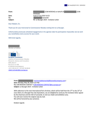 "content": "Ref. Ares(2022)3112512 - 20/04/2022 From: (CAB-MOEDAS) on behalf of (CAB- MOEDAS) Sent: lundi 27 mai 2019 14:53 To: Leonardo' Subject: RE: Le Bourget 2019 - Invitation Letter Dear Madam, Sir, Thank you for your kind email to Commissioner Moedas inviting him to Le Bourget. Unfortunately previously scheduled engagements in his agenda make his participation impossible, but we wish you nonetheless every success for your event. With kind regards, Member of Cabinet European Commission Cabinet of Commissioner Moedas Research, Science and Innovation BERL 09/127 Rue de la Loi 200 B-1049 Brussels/Belgium +32 2 295 61 67 / +32 497 40 88 80 robert.schroder@ec.europa.eu From: <cerimonialeleonardo@leonardocompany.com> Sent: Monday, May 20, 2019 3:37 PM To: CAB MOEDAS CONTACT <CAB-MOEDAS-CONTACT@ec.europa.eu> Subject: Le Bourget 2019 - Invitation Letter With reference to the next International Paris Airshow, which will be held from the 17 to the 23 of th rd June 2019, at Le Bourget Parc des Expositions, we are delighted to send you the invitation letter signed by the Chairman and the CEO of Leonardo, to visit our chalet and exhibition area. You will soon receive the original copy by mail. We will be honored by your presence. Kindest regards",