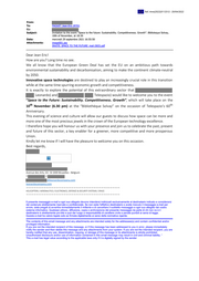 "content": "Ref. Ares(2022)3112512 - 20/04/2022 From: To: PAQUET Jean-Eric (RTD) Cc: Subject: Invitation to the event \"Space to the future: Sustainability. Competitiveness. Growth\". Biblioteque Solvay, 10th of November, at 18:30 Date: mercredi 29 septembre 2021 16:55:50 Attachments: image001.jpg INVITE SPACE TO THE FUTURE mail (003).pdf Dear Jean Eric! How are you? Long time no see. We all know that the European Green Deal has set the EU on an ambitious path towards environmental sustainability and decarbonisation, aiming to make the continent climate-neutral by 2050. Innovative space technologies are destined to play an increasingly crucial role in this transition while at the same time spurring economic growth and competitiveness. It is exactly to explore the potential of this extraordinary sector that Leonardo) and Telespazio) would like to welcome you to the event “Space to the Future: Sustainability. Competitiveness. Growth”, which will take place on the 10 th th November (6.30 pm) at the “Bibliothèque Solvay” on the occasion of Telespazio’s 60 Anniversary. This evening of science and culture will allow our guests to discuss how space can be more and more one of the most precious jewels in the crown of the European technology excellence. I therefore hope you will honour us with your presence and join us to celebrate the past, present and future of this sector, a key enabler for a greener, more competitive and more prosperous Union. Kindly let me know if I will have the pleasure to welcome you on this occasion. Best regards, Avenue des Arts, 43 - B-1000 Bruxelles - Belgium T F @leonardocompany.com leonardocompany.com ————————————————————————————————–————— HELICOPTERS / AERONAUTICS / ELECTRONICS, DEFENCE & SECURITY SYSTEMS / SPACE ————————————————————————————————–————— Il presente messaggio e-mail e ogni suo allegato devono intendersi indirizzati esclusivamente al destinatario indicato e considerarsi dal contenuto strettamente riservato e confidenziale. Se non siete l'effettivo destinatario o avete ricevuto il messaggio e-mail per errore, siete pregati di avvertire immediatamente il mittente e di cancellare il suddetto messaggio e ogni suo allegato dal vostro sistema informatico. Qualsiasi utilizzo, diffusione, copia o archiviazione del presente messaggio da parte di chi non ne è il destinatario è strettamente pro bito e può dar luogo a responsabilità di carattere civile e penale punibili ai sensi di legge. Questa e-mail ha valore legale solo se firmata digitalmente ai sensi della normativa vigente. The contents of this email message and any attachments are intended solely for the addressee(s) and contain confidential and/or privileged information. If you are not the intended recipient of this message, or if this message has been addressed to you in error, please immediately notify the sender and then delete this message and any attachments from your system. If you are not the intended recipient, you are hereby notified that any use, dissemination, copying, or storage of this message or its attachments is strictly prohibited. Unauthorized disclosure and/or use of information contained in this email message may result in civil and criminal liability. “ This e-mail has legal value according to the applicable laws only if it is digitally signed by the sender",