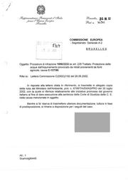 "content": "Tcf ÜHSCHLAREO Iormanente a Aarlir\n! Khuone Er\nreso Hmone Qurofea\n\n« Baur Re Mas\n\nBe\n\nun L UL\n\nl\nBann ann nn nen in samen\n\nPot n. OBU\n\nCOMMISSIONE EUROPEA\n- Segretariato Generale A-2\n\nBRUXELLES\n\nOggetto: Procedura di infrazione 1996/2232 ex art. 228 Trattato: Protezione delle\nacque dall'inquinamento provocato da nitrati provenienti da fonti\n\nagricole; causa C-127/99.\n\nRifer.to: Lettera Commissione C(2002)2192 del 26.06.2002.\n\nIn risposta alla lettera citata in riferimento, si trasmette in allegato copia\ndella nota del Ministero dell'Ambiente, prot. n. 6798/TAU/DVAG/PRO del 30 luglio\n2002, con la quale si riferisce relativamente alle iniziative promosse dal governo\nitaliano al fine di dare esecuzione alla sentenza della Corte di Giustizia delle C. E.\n\nnella causa menzionata in oggetto.\n\nMentre si fa’ riserva di trasmettere ulteriore documentazione, tuttora in fase\ndi predisposizione, si rimane a disposizione per i seguiti del caso.\n\nAll: 1\nSca/notgl644S",