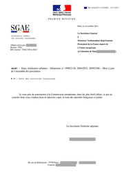 "content": "Ref. Ares(2011)1216983 - 15/11/2011 PREMIER MINISTRE Paris, le 14 octobre 2011 Le Secrétaire Général SECRÉTARIAT GÉNÉRAL à DES AFFAIRES EUROPÉENNES Monsieur l'Ambassadeur Représentant Affaire suivie par : Permanent de la France auprès de Secteur ITEC L'Union européenne Réf courrier : ITEC/ 0914 /2011 (à l'attention de Mme ) OBJET : Eaux résiduaires urbaines - Infractions n° 1998/2110, 2004/2032, 2009/2306 – Mise à jour de l’ensemble des procédures P.J. : Note des autorités françaises Je vous prie de transmettre à la Commission européenne, dans les plus brefs délais, et par un courrier dont vous voudrez bien m’adresser copie, la note des autorités françaises ci-jointe. La Secrétaire Générale adjointe, 68, rue de Bellechasse - 75700 Paris – – Courriel :",