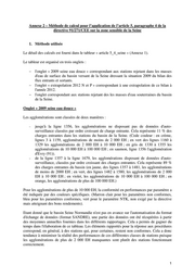 "content": "Annexe 2 – Méthode de calcul pour l’application de l’article 5, paragraphe 4 de la directive 91/271/CEE sur la zone sensible de la Seine 1. Méthode utilisée Le détail des calculs est fourni dans le tableur « article 5_4_seine » (Annexe 1). Le tableur est organisé en trois onglets : l'onglet « 2009 seine eau douce » correspondant aux stations rejetant dans les masses d'eau de surface du bassin versant de la Seine dressant la situation 2009 du bilan des flux entrants et sortants. l'onglet « extrapolation 2012 N et P » correspondant à une extrapolation de ce bilan à l'année 2012. l'onglet correspondant aux stations rejetant des les masses d'eau souterraines du bassin de la Seine. Onglet « 2009 seine eau douce » Les agglomérations sont classées de deux manières : jusqu'à la ligne 1356, les agglomérations ne disposant pas de données d'auto- surveillance classées par ordre croissant de charge entrante. Cela représente 11 % des charges entrantes dans les stations du bassin de la Seine. (Code couleur : en crème, lignes 3 à 1159, agglomérations de moins de 2 000 EH ; en vert des lignes 1160 à 1329 les agglomérations de 2 000 EH à 10 000 EH ; en gris de 1330 à 1355 les agglomérations de 10 000 EH à 100 000 EH ; en saumon, ligne 1356 l'agglomération d'Evry (91)). de la ligne 1357 à la ligne 1679, les agglomérations disposant de données d'auto- surveillance, classées par ordre croissant des charges entrantes. Cela représente 89 % des charges entrantes du bassin (en jaune, des lignes 1357 à 1481, les agglomérations de moins de 2000 EH ; en vert, des lignes 1482 à 1580, les agglomérations de 2 000 EH à 10 000 EH ; en violet, les agglomérations de 10 000 EH à 100 000 EH ; en orange, les agglomérations de plus de 100 000 EH.) Pour les agglomérations de plus de 10 000 EH, la conformité en performances par paramètre a été indiquée par des couleurs spécifiques. (Marron clair pour les paramètres non conformes, bleu pour les paramètres conformes, vert pour le paramètre NTK, non exigé par la directive mais atteignant des bons rendements). Etant donné que le bassin Seine Normandie n'est pas en avance sur l'automatisation du format d'échange de données (format SANDRE), une partie des données ont été récupérées à partir des moyennes annuelles fournies dans les différents rapportages. Cela a permis de gagner du temps dans l'élaboration de ce tableau. Les éléments rapportés pour la réponse aux procédures correspond, en général, à des stations qui, pour certaines, restent non conformes. Cela a donc tendance à minimiser la réalité des performances de ces différentes classes de stations puisque les agglomérations de plus de 2 000 EH manquantes sont plutôt des stations fonctionnant correctement. 1",