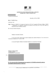 "content": "u\nLiberis - Egalitl »\nREPUBLIQUE FRANCAISE\n\n \n\nruternite\n\nREPRESENTATION PERMANENTE DE LA FRANCE\nAUPRES DE L’UNION EUROPEENNE\n\nConseiller Environnement\nBruxelles, le 29 avril 2008\nRef. : N° 1255 / FG / ip\nJUR SJ 624/08\nObjet : Infraction n°1998/2110 - Execution de l’arr&t de la CJCE du 23 septembre 2004 dans l’affaire C-280/02\n— Manquement aux obligations resultant de la directive 9/271V/CEE du 21 mai 1991 relative au\n\ntraitement des eaux residuaires urbaines\n\nPJ : Note des Autorites frangaises\n\nMadame la Secretaire Generale,\n\nJe vous prie de bien vouloir trouver ci-joint la reponse des Autorites frangaises ä l’avis motiv& de la\nCommission europeenne du 31 janvier 2008.\n\nJe vous prie d’agreer, Madame la Sceretaire Generale, mes respectueux hommages.\n\nMadame Catherine DAY\nSecretaire generale\nCOMMISSION EUROPEENNE\n\nCq:\n\nPS : En raison du delai d’acheminement par courrier, le CD-ROM contenant les annexes\nparviendront ulterieurement ä P’unite A2.\n\n \n\n14, Place de Louvain - 1000 BRUXELLES - TEL. 322 229 82 11 - FAX 322 229 82 82",