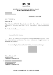 "content": "� Libenf! • �galitf! • Fralerniti? REPUBLIQUE FRAN<;:AlSE REPRESENTATION PERMANENTE DE LA FRANCE AUPRES DE L'UNION EUROPEENNE Bruxelles, le 20 fevrier 2008 Ref.: N 478 / FG I ip ° JUR SJ 248 I 08 ° Objet: Infraction n 1998/4423 - Execution de l'arret de la Cour de Justice des Communautes europeennes du 7 octobre 2004 dans l'affaire C-239/03 Etang de Berre Bilan du second semestre 2007 PJ : Note des Autorites frarn;aises + 7 annexes Madame la Secretaire Generale, Je vous prie de bien vouloir trouver ci-joint une note des Autorites frarn;aises, ainsi que des pieces jointes, relatives au suivi des rejets d'eau douce et de limons dans l'etang de Berre et de sa salinite jusqu'au 30 juin 2007. Je vous prie d'agreer, Madame la Secretaire Generale, mes respectueux hommages. Madame Catherine DAY Secretaire Generale COMMISSION EUROPEENNE Cq : DG Environnement A2 COMMISSION EUROPEENNE 14, Place de Louvain - 1000 BRUXELLES - TEL. 322 229 82 11 - FAX 322 229 82 82",