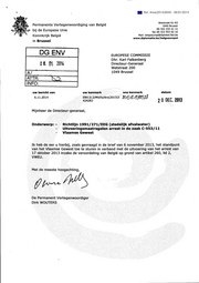 "content": "Ref. Ares(2014)9545 - 06/01/2014 Wetstraat 61-63 Permanente Vertegenwoordiging van België 1040 Brussel 00 322 233 21 11 bij de Europese Unie fax 00 322 553 62 10 Koninkrijk België Mali: belgoeurop@diplobel.fed.be www.diplomatie.be/belgoeuropnl in Brussel DG ENV EUROPESE COMMISSIE Dhr. Karl Falkenberg oe, oi m Directeur-Generaal Wetstraat 200 А/ 1049 Brussel ATTR: ľss; INFO: uw bericht van uw kenmerk ons kenmerk datum 6.11.2014 ĖNV.D.2/MV/ts/Ars(2013)3 я ncr 4IM, 424283 2 0 \"tl. ZülO Mijnheer de Directeur-generaal, Onderwerp: - Richtlijn 1991/271/EEG (stedelijk afvalwater) Uitvoeringsmaatregelen arrest in de zaak С-553/11 Vlaamse Gewest Ik heb de eer u hierbij, zoals gevraagd in de brief van 6 november 2013, het standpunt van het Vlaamse Gewest toe te sturen in verband met de uitvoering van het arrest van 17 oktober 2013 inzake de veroordeling van België op grond van artikel 260, lid 2, VWEU. Met de meeste hoogachting. ¡Çl·- De Permanent Vertegenwoordiger Dirk WOUTERS",