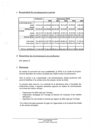 "content": "Recapitulatif des investissements A prevoir\n\n| Fatimaton | Financement SPGE\n2000 2001 2002 2003\n\n1) ENCOURS (R.W.):\netudesl 547.655. ” 334.070. “ 103.257. ” 78.712. ” 29.529. er 2.085. ”\nactions\n\nTOTAL R.W. SIT BB5335 m: 103. 157000 mat 29.529. m FR\n\n \n\nTOTAL SPGE | 1 ‚626. 909. 730 445. 531. 600 295. 684. 765 307. 326. 442 288. 591. 341 289. 275. ‚082\n\nTotal etudes\n\n \n\nTOTAL GENERAL] 2.174.565.185|779.602.426|398.942.414|386.538.479|318.121.784|291.360.082\n\n”\n\nd. Repartition des investissements par producteur\n\n \n\n(cfr. annexe 2)\n\ne. Remarque\n\nEn matiere de protection des eaux potabilisables, la SPGE et le Comite des Experts\n‚devront determiner des criteres normatifs pour Etablir le plan d’investissements.\n\nSans en arriver ä un « saupoudrage » des investissements, chaque producteur doit\npouvoir ben£ficier d’un certain retour des sommes versees au fonds.\n\nLa priorite etant reservee ä la continuite de la distribution d’eau ä l’ensemble des\n\n- collectivites locales, il apparait neanmoins opportun de r£aliser les investissements\n‘sur la base des criteres suivants :\n\n- l’importance du debit capte par l’ouvrage ;\n- limportance strategique de l’ouvrage en fonction de l’existence d’une solution\nalternative ;\n\n- _importance du coüt (Etudes et actions) par rapport au debit capte par l’ouvrage.\n\nCes criteres devraient permettre de juger de l’opportunite et de la priorite des Etudes\net des actions envisagees.\n\n \n\nProgramme d’investissements de la SPGE\nperiode 2000-2004\n(Q-comite-C.A.-notes) — 6 octobre 2000",