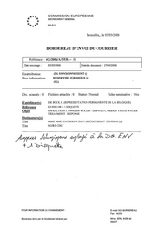 "content": "COMMISSION EUROPEENNE SECRETARIAT GENERAL SG.R.2 Bruxelles,, le 03/05/2006 BORDEREAU D'ENVOI DU COURRIER Reference : SG/2006/A/3530.-- /1 Date encodage 03/05/2006 I Date du document : 27/04/2006 En attribution: (DG ENVIRONNEMENT()) Pour information: M (SERVICE JURIDIQUE ()) (SG) Doc. scannes : 0 Fichiers attaches : 0 Statut : Normal Fiche nominative : Non Expediteur{s) DE BOCK J. (REPRESENTATION PERMANENTE DE LA BELGIQUE) Reference E2-950-I 148 + I DISQUETTE Obiet INFRACTION A 1999/2030 WATER- DIR 91/271, URBAN WASTE-WATER TREATMENT - REPONSE Destinataire(s) Titre MME MME CATHERINE DAY (SECRETARIAT GENERAL ()) Titre SG/R/2 CDC ,,.A� lo�� �17 �AD&. E/V ✓ + � �g,�� POUR INFORMATION OU CHANGEMENT: E-mail: SG BORDEREAU Fax: 64335 Bordereau emis par le Secretariat General par : Mme BERL 8/289 tel. 59227",